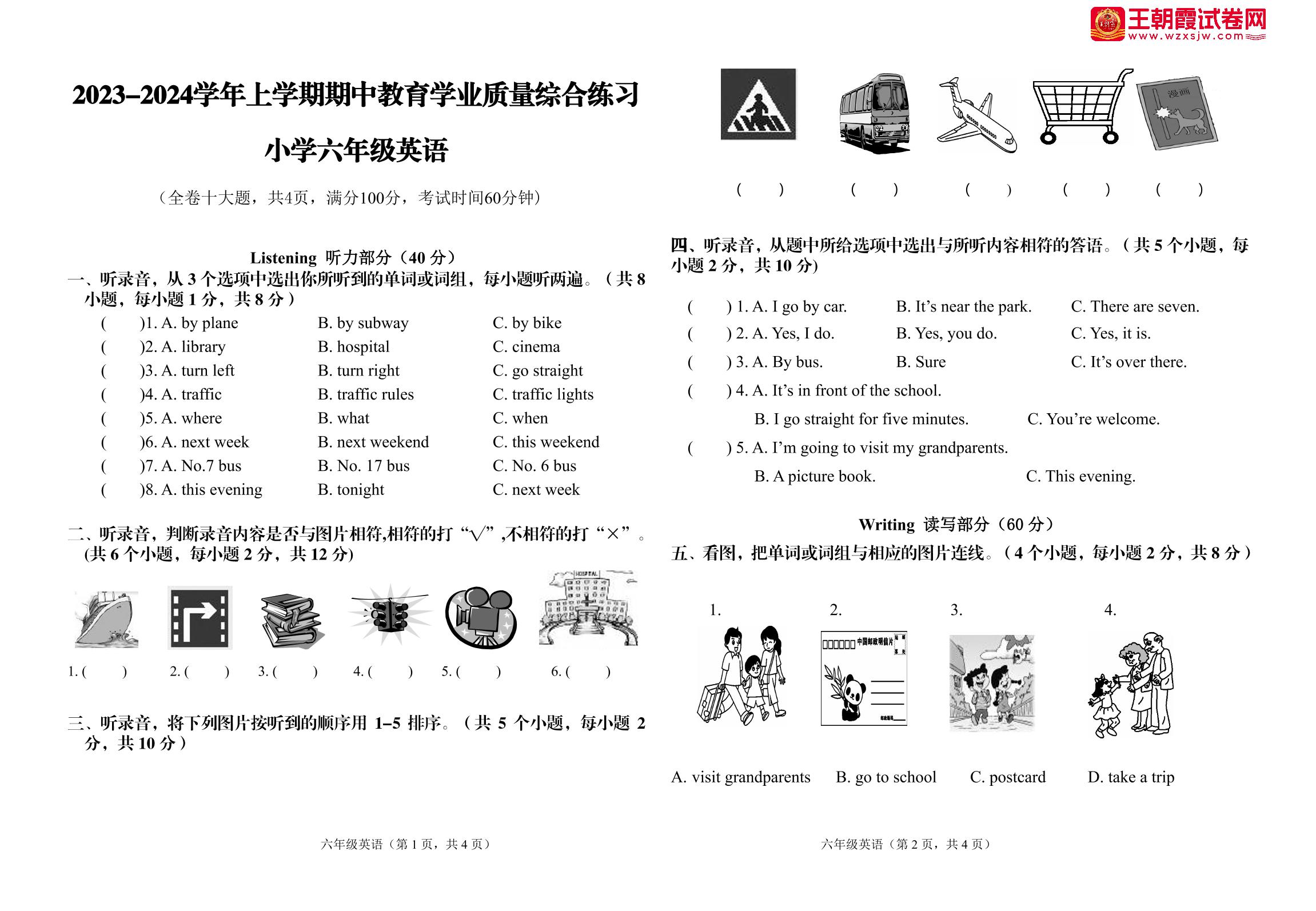 云南省楚雄彝族自治州楚雄市2023-2024学年上学期期中教育学业质量综合练习试卷六年级英语(人教PEP版)