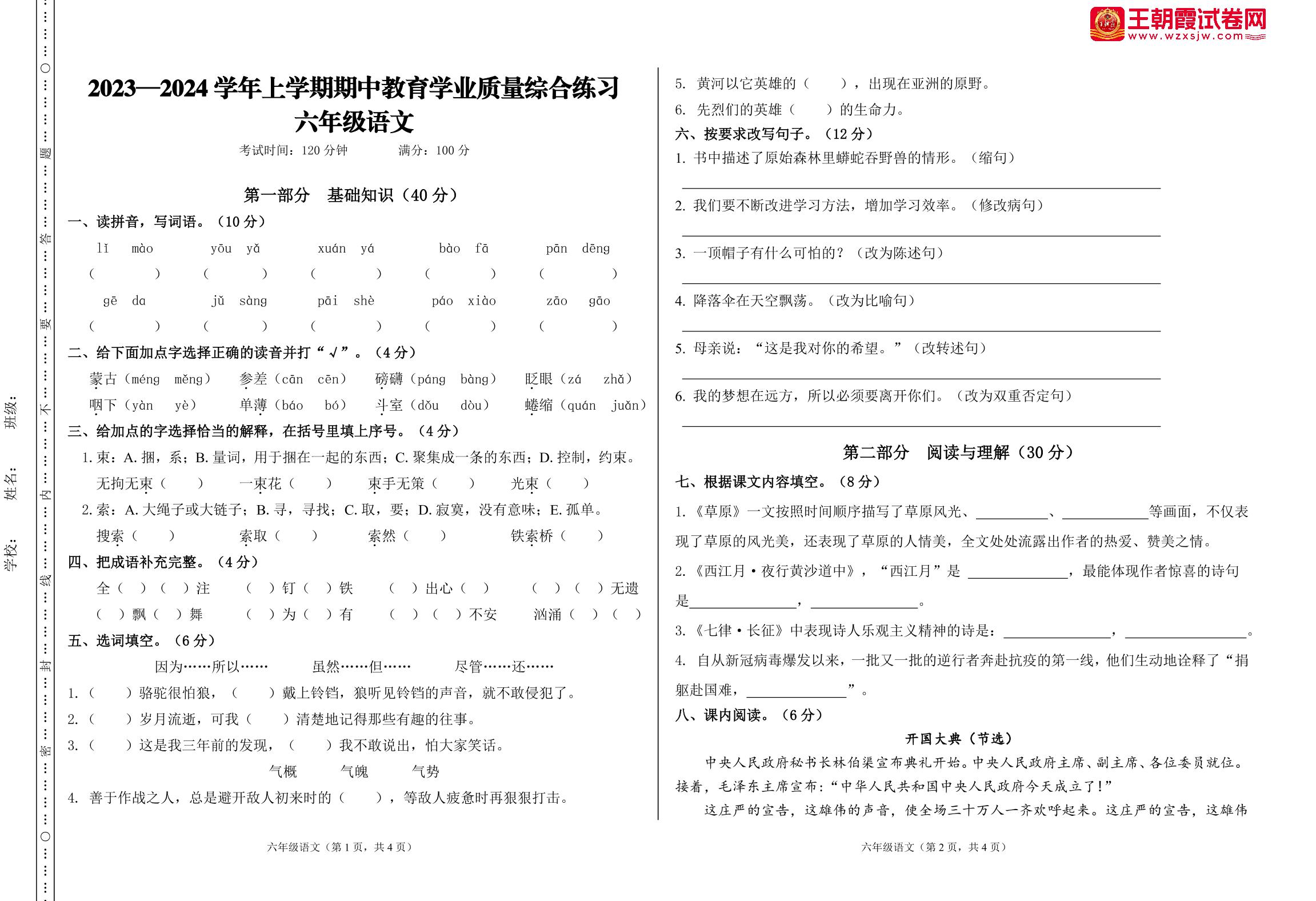 云南省楚雄彝族自治州楚雄市2023-2024学年上学期期中教育学业质量综合练习试卷六年级语文(人教版)