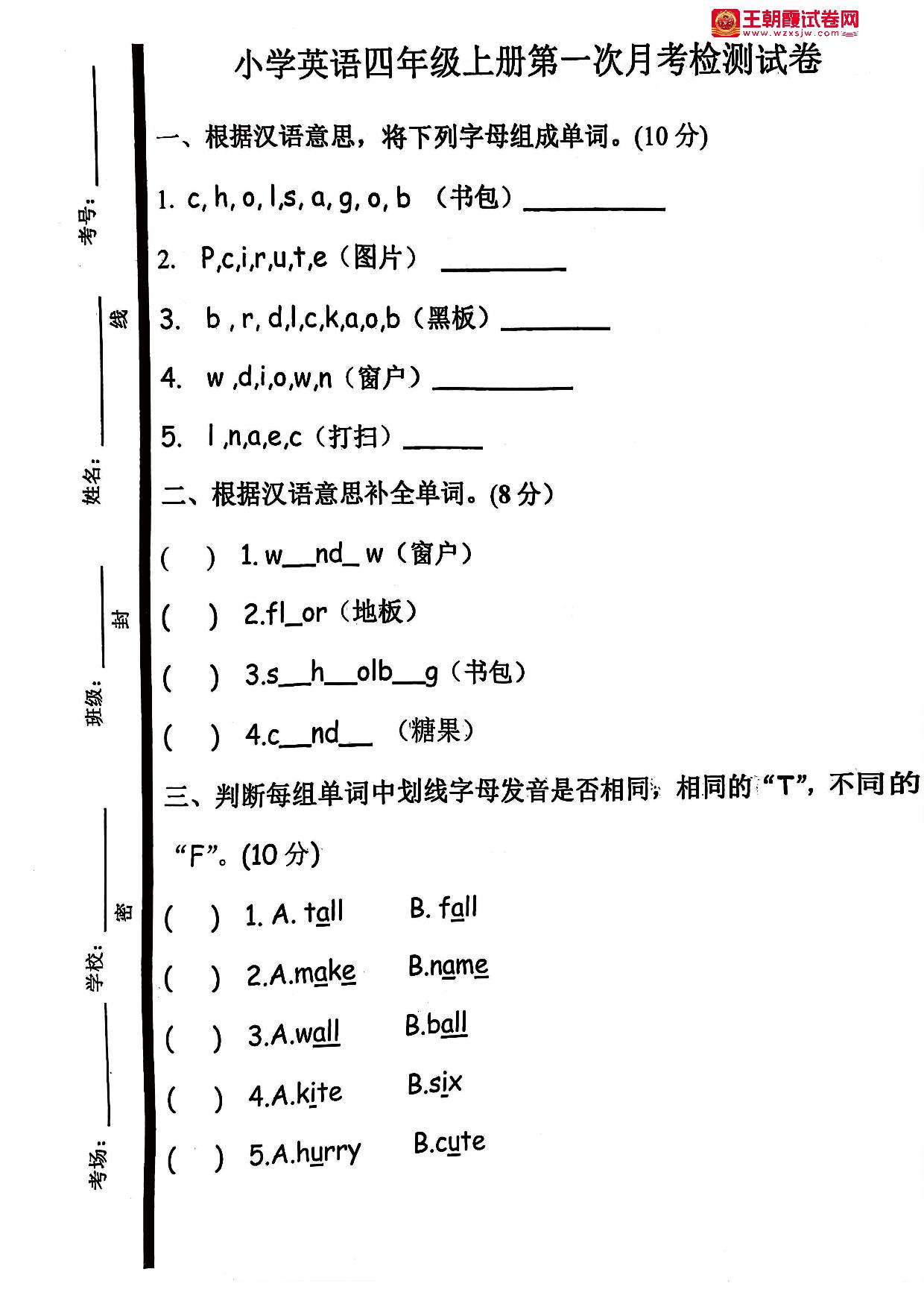 四年级英语人教PEP版(三起始)上册月考卷