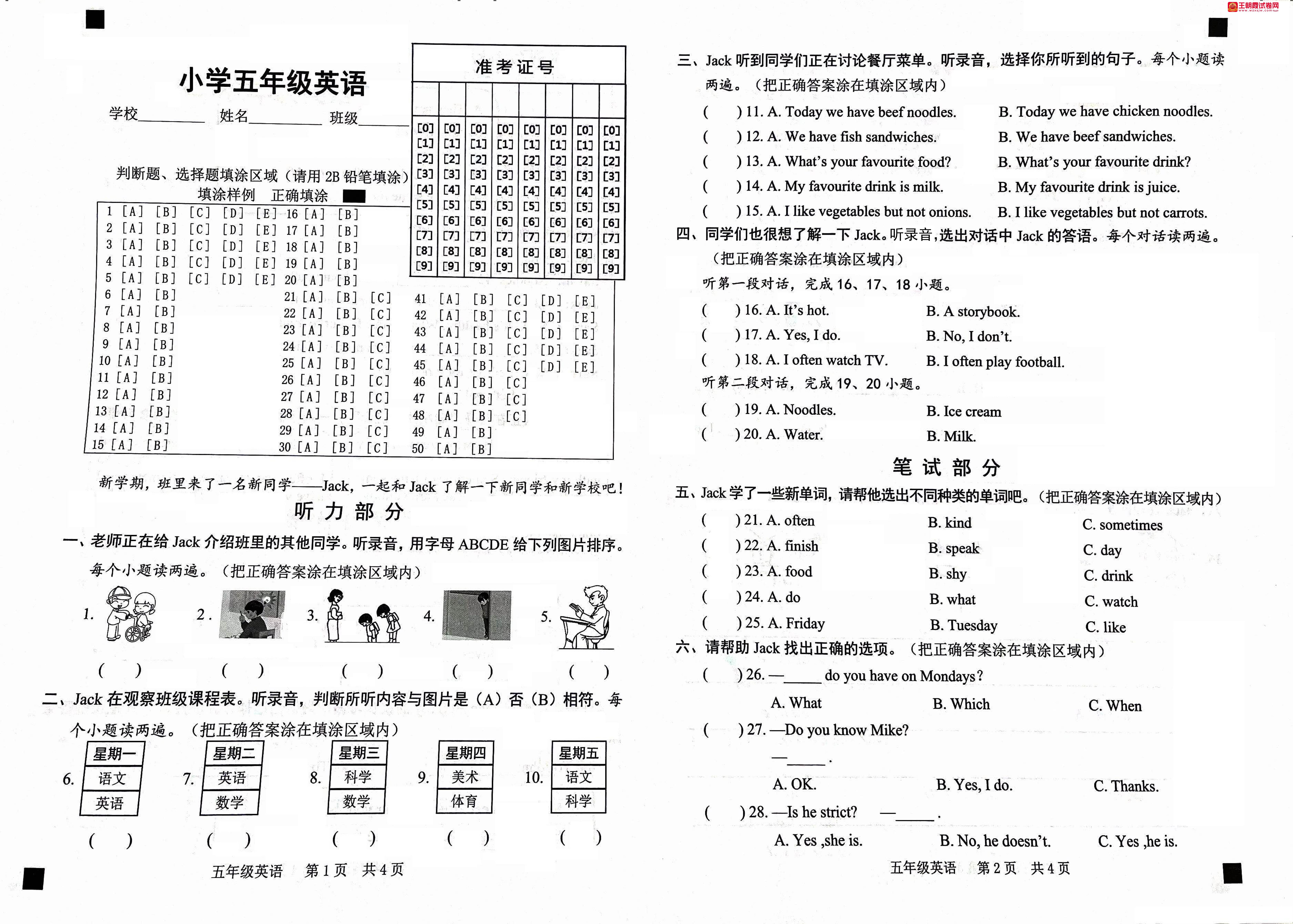 山东省菏泽市牡丹区2023-2024学年第一学期期中检测卷五年级英语(人教PEP版)