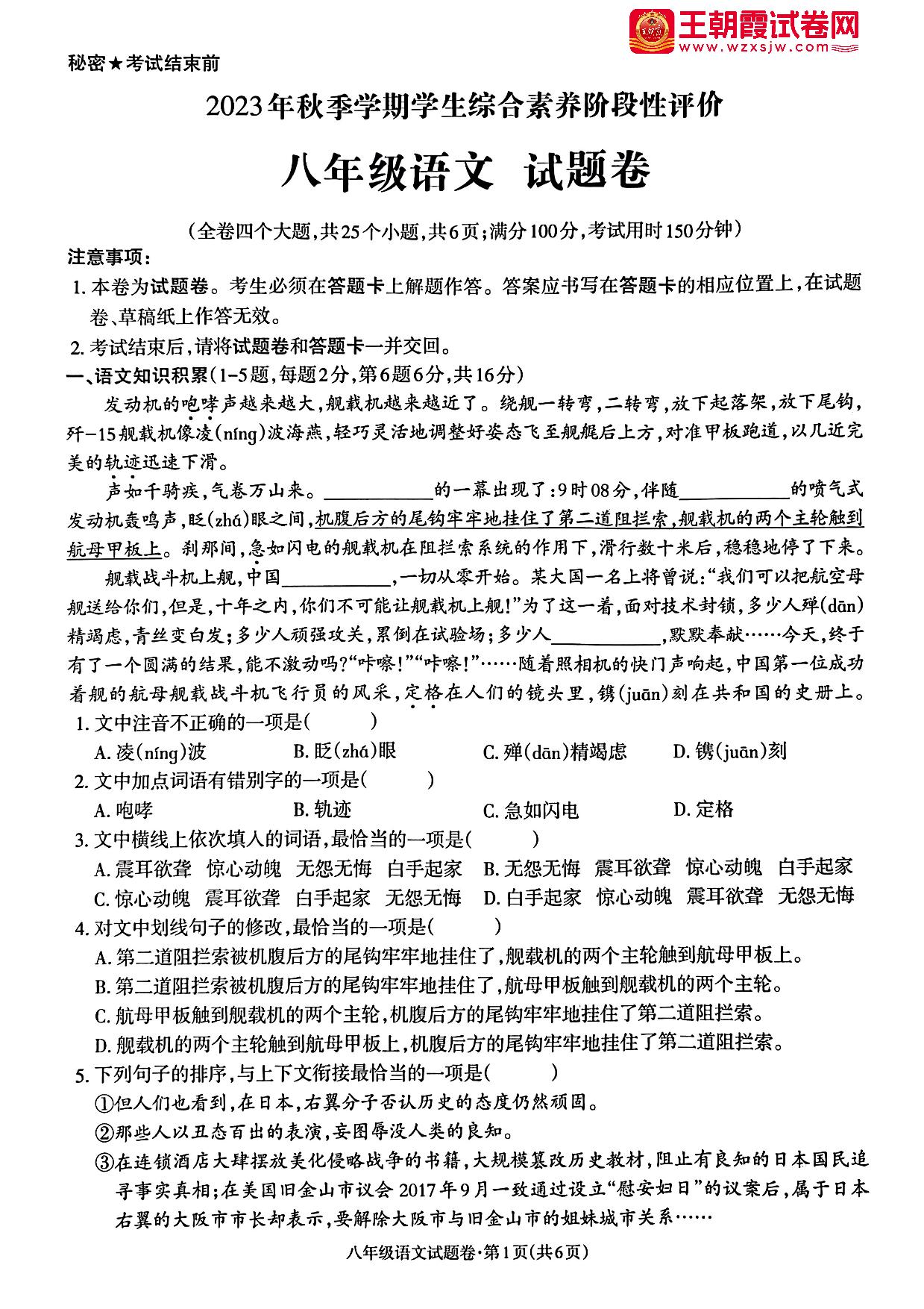云南省昭通市昭阳区2023-2024学年上学期学生综合素养阶段性评价期中试题卷八年级语文(人教版)