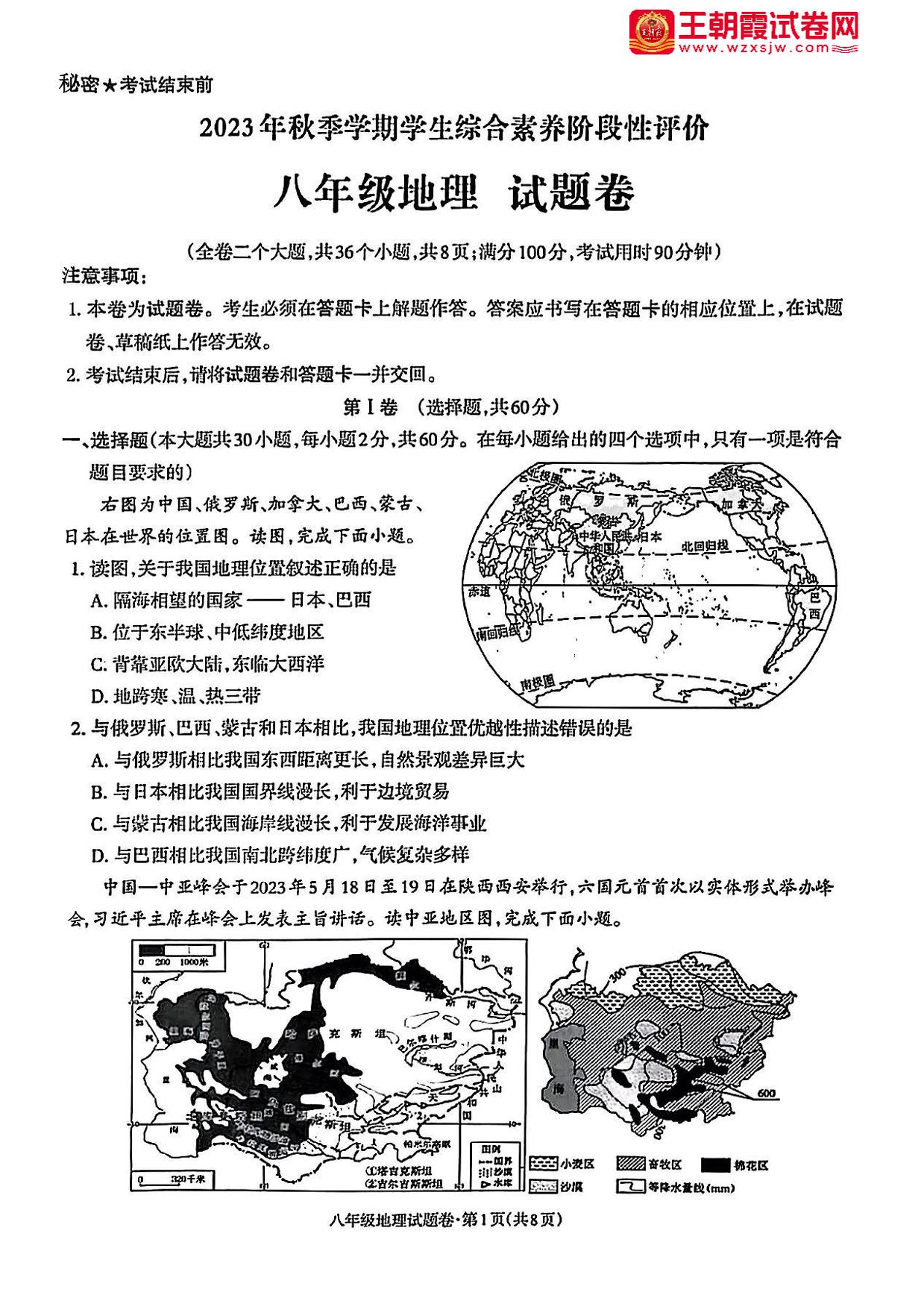 云南省昭通市昭阳区2023-2024学年上学期学生综合素养阶段性评价期中试题卷八年级地理(人教版)