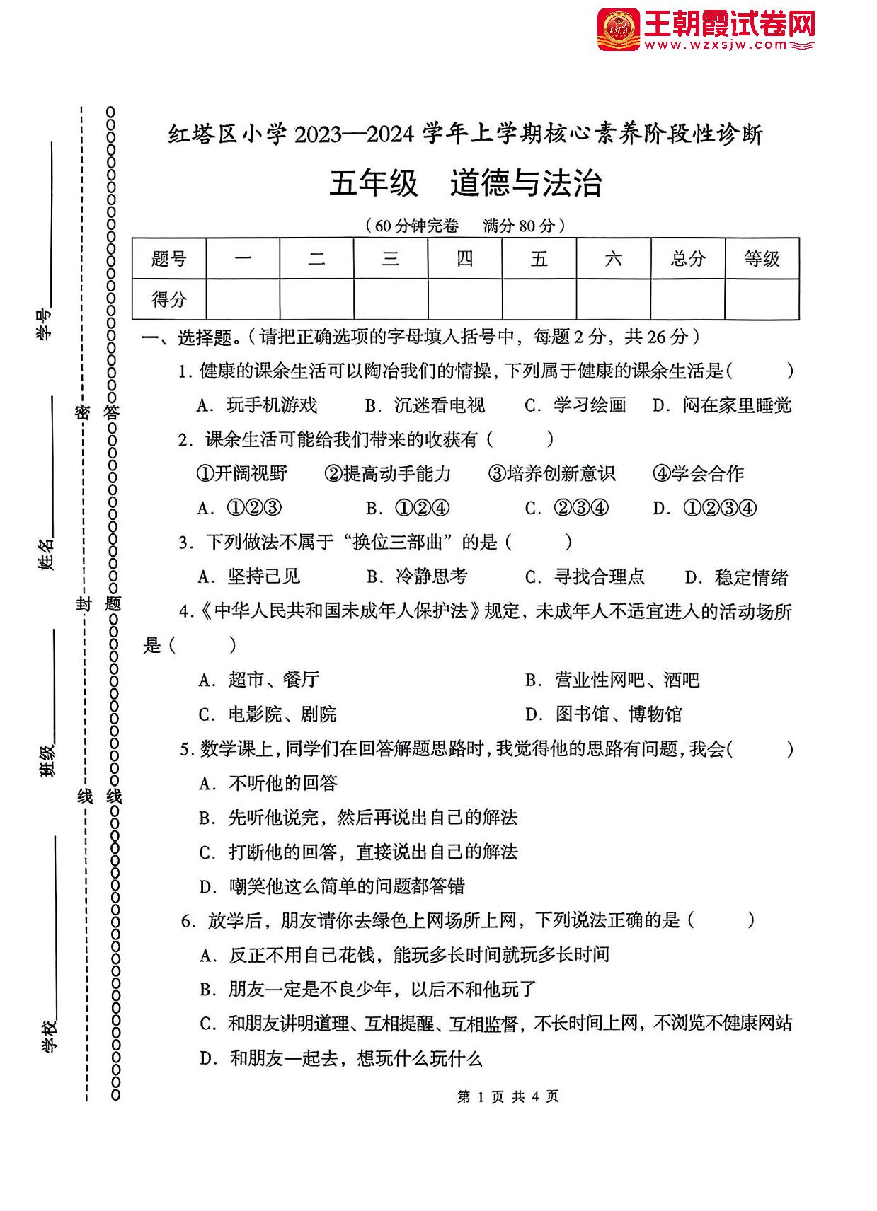 云南省玉溪市红塔区小学2023-2024学年上学期核心素养阶段性诊断期中试卷五年级道德与法治(人教版)