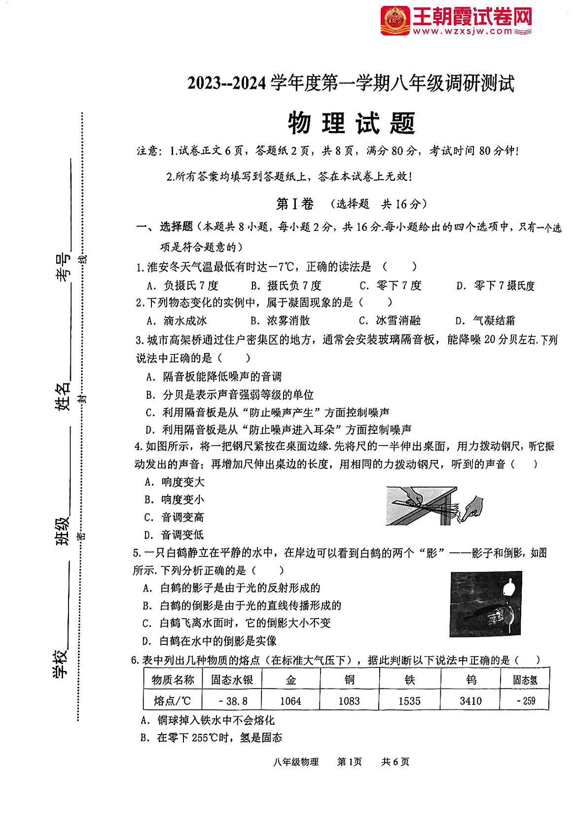江苏省淮安市淮阴区2023-2024学年度第一学期调研测试八年级物理(苏科版)