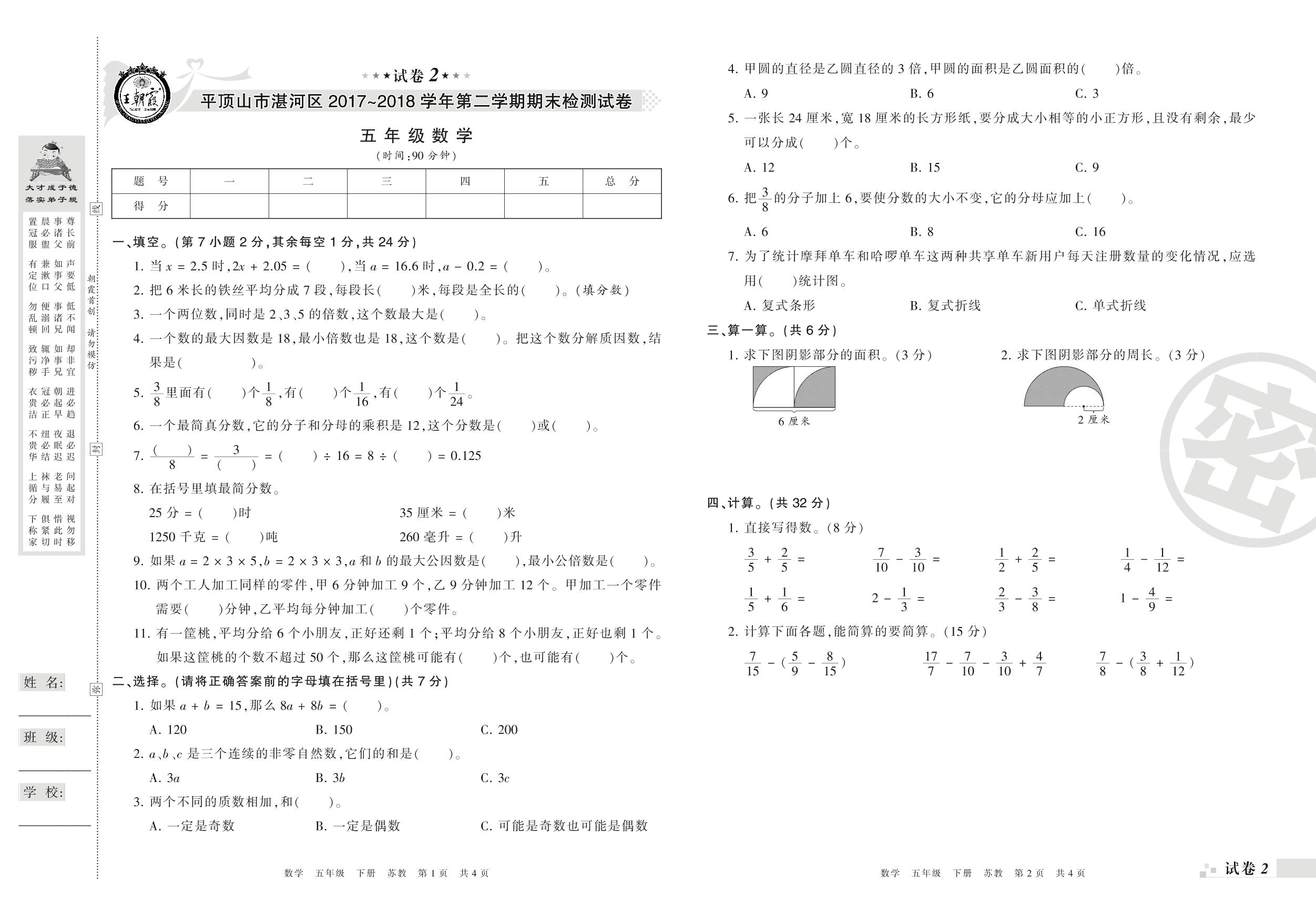 2017-2018学年第二学期平顶山市湛河区五年级数学试卷(苏教版)【2】
