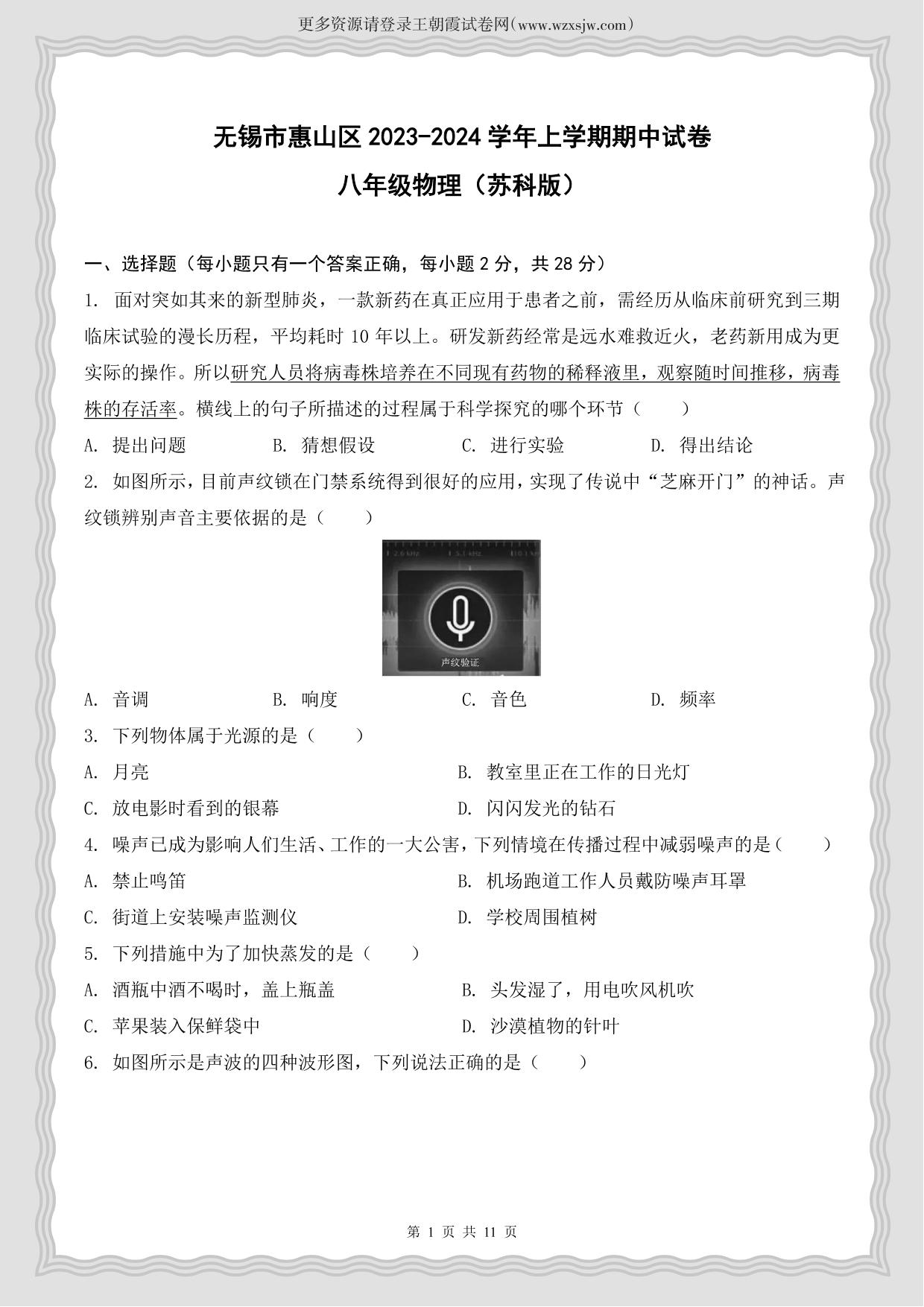 江苏省无锡市惠山区2023-2024学年上学期期中试卷八年级物理(苏科版)
