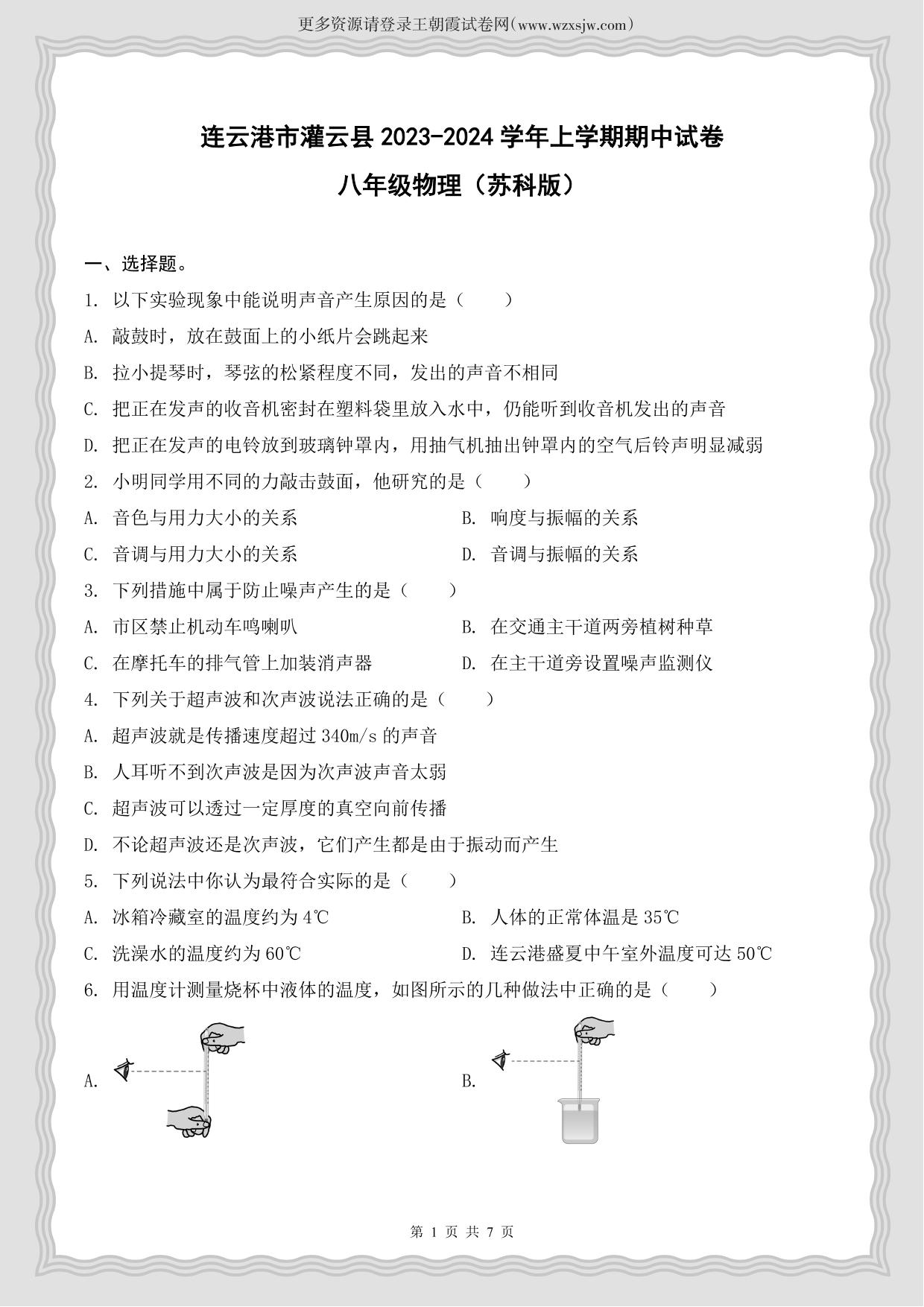 江苏省连云港市灌云县2023-2024学年上学期期中试卷八年级物理(苏科版)