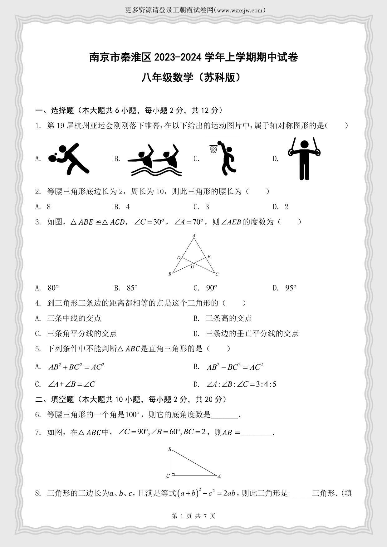 八年级数学苏科版上册期中卷