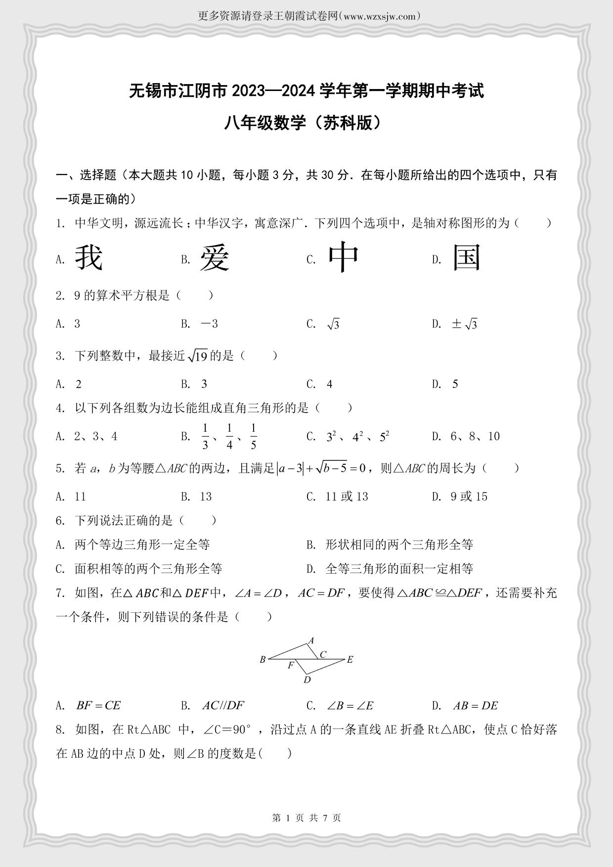 江苏省无锡市江阴市2023-2024学年第一学期期中考试八年级数学(苏科版)