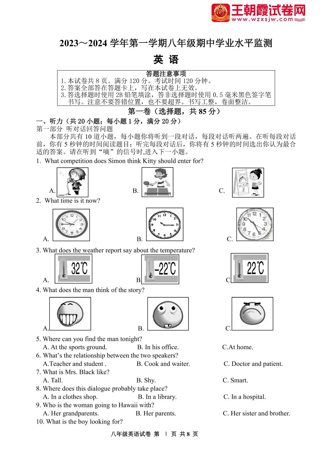 江苏省宿迁市泗阳县2023-2024学年第一学期期中学业水平监测八年级英语(译林版)