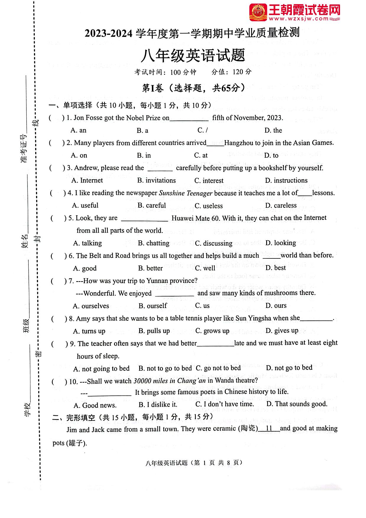 江苏省连云港市灌云县2023-2024学年度第一学期期中学业质量检测八年级英语(译林版)