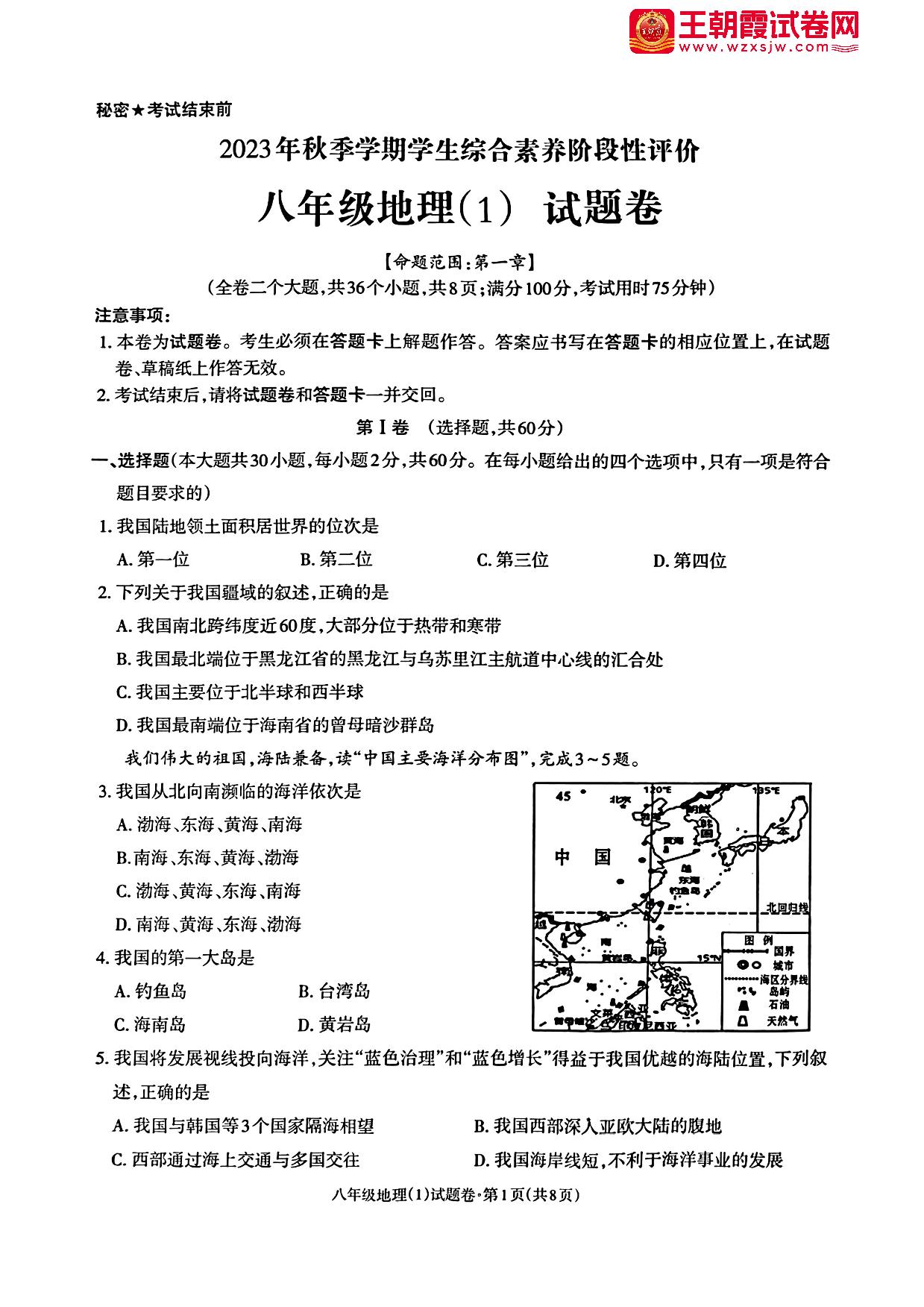 云南省昭通市昭阳区2023-2024学年上学期学生综合素养阶段性评价10月月考试题卷八年级地理(人教版)