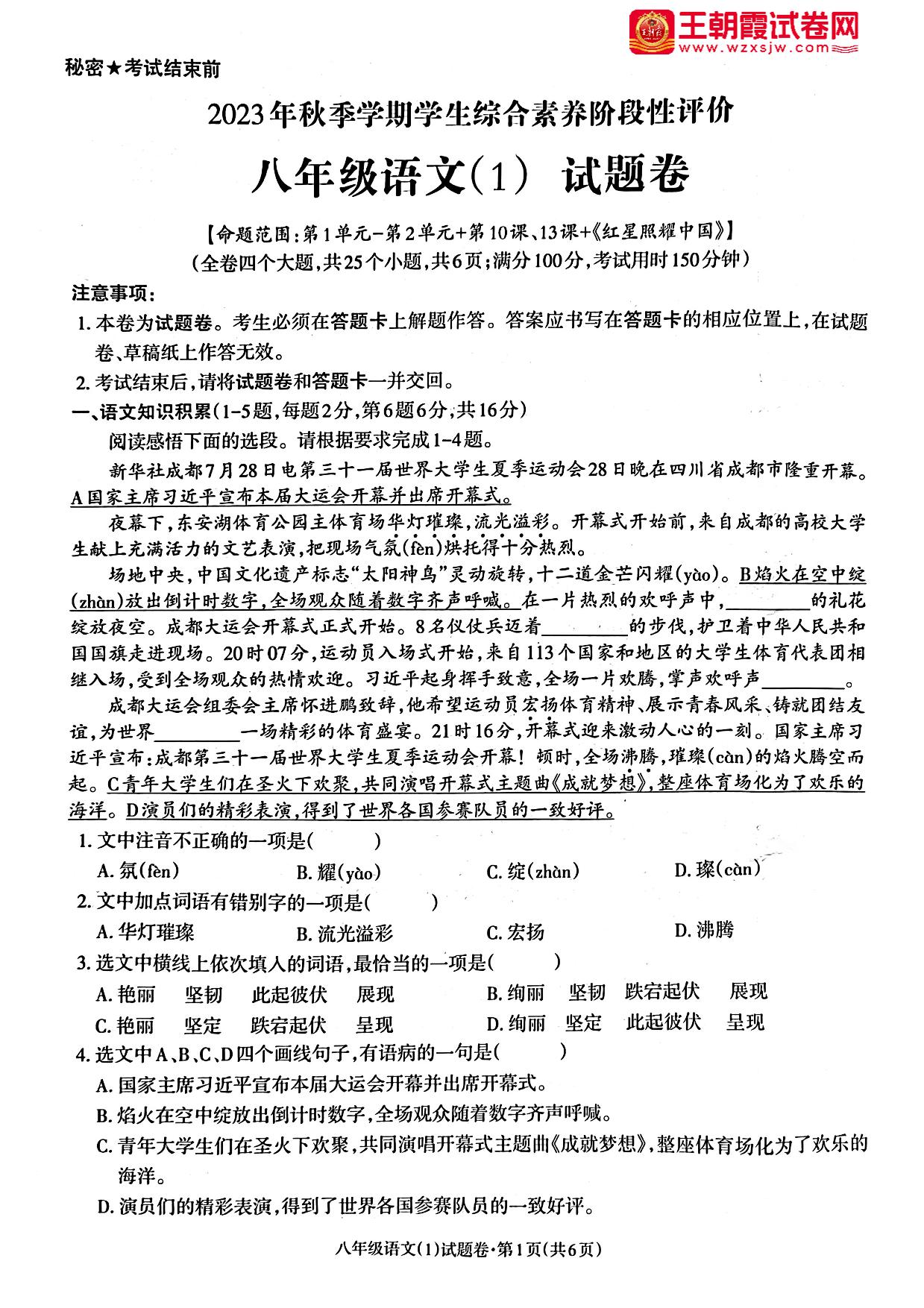 云南省昭通市昭阳区2023-2024学年上学期学生综合素养阶段性评价10月月考试题卷八年级语文(人教版)
