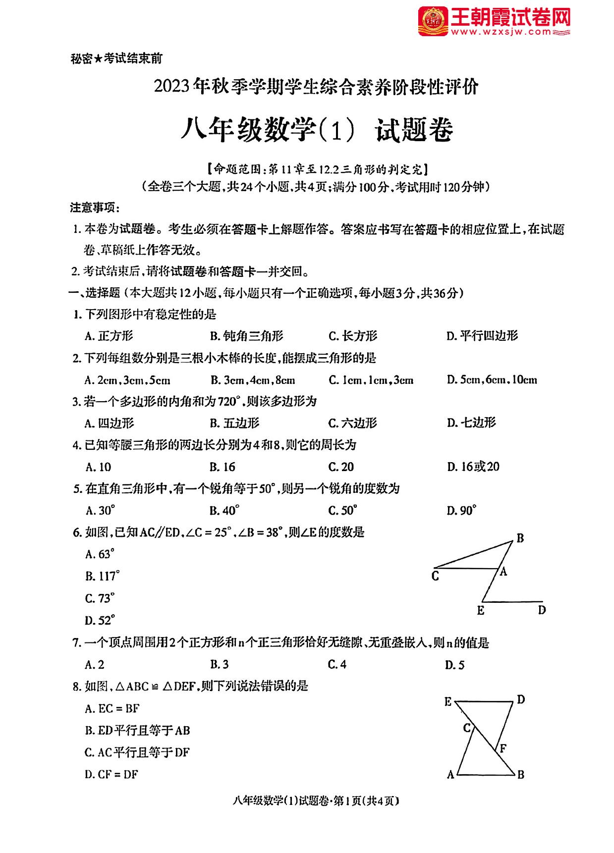 云南省昭通市昭阳区2023-2024学年上学期学生综合素养阶段性评价10月月考试题卷八年级数学(人教版)