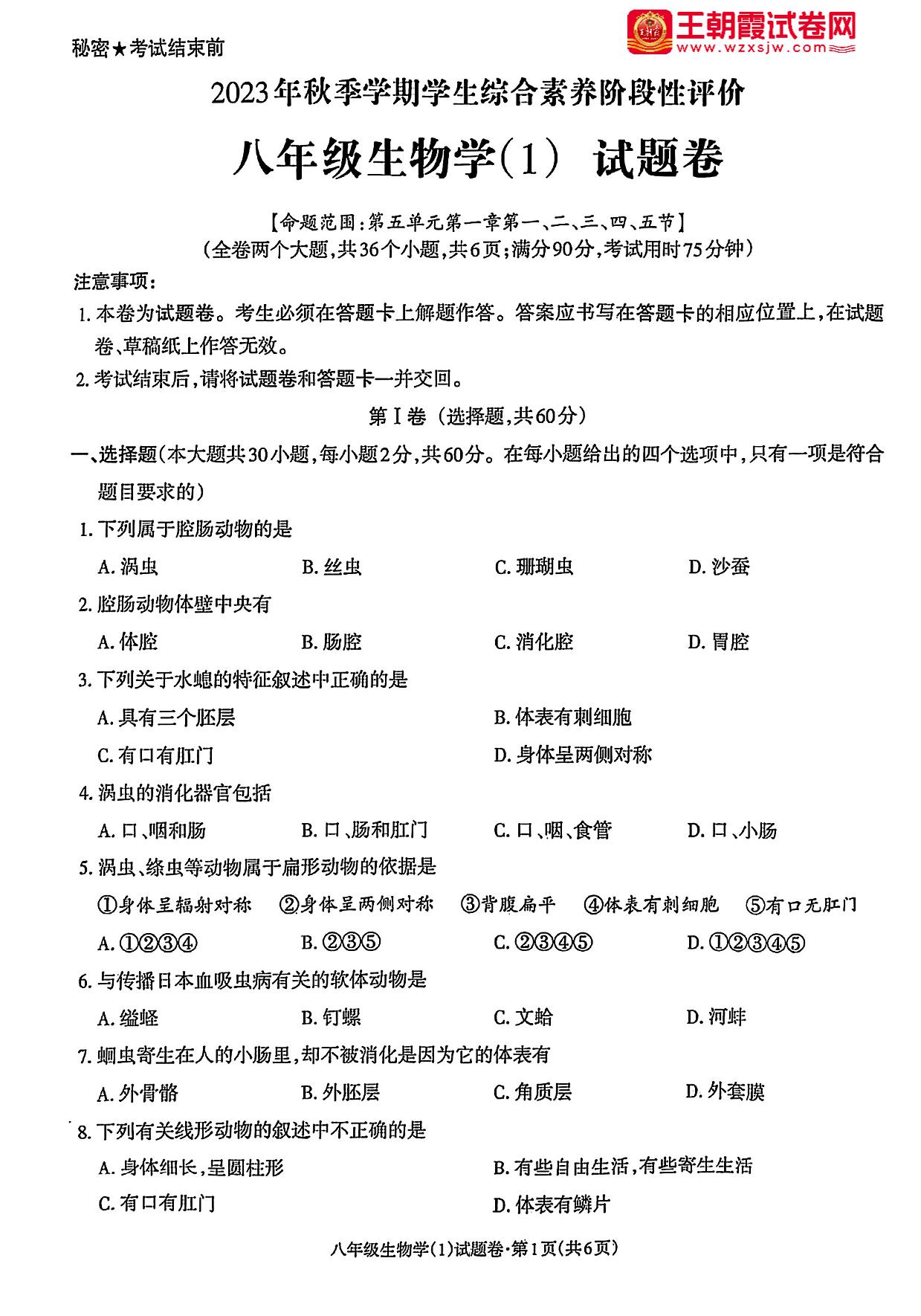 云南省昭通市昭阳区2023-2024学年上学期学生综合素养阶段性评价10月月考试题卷八年级生物(人教版)
