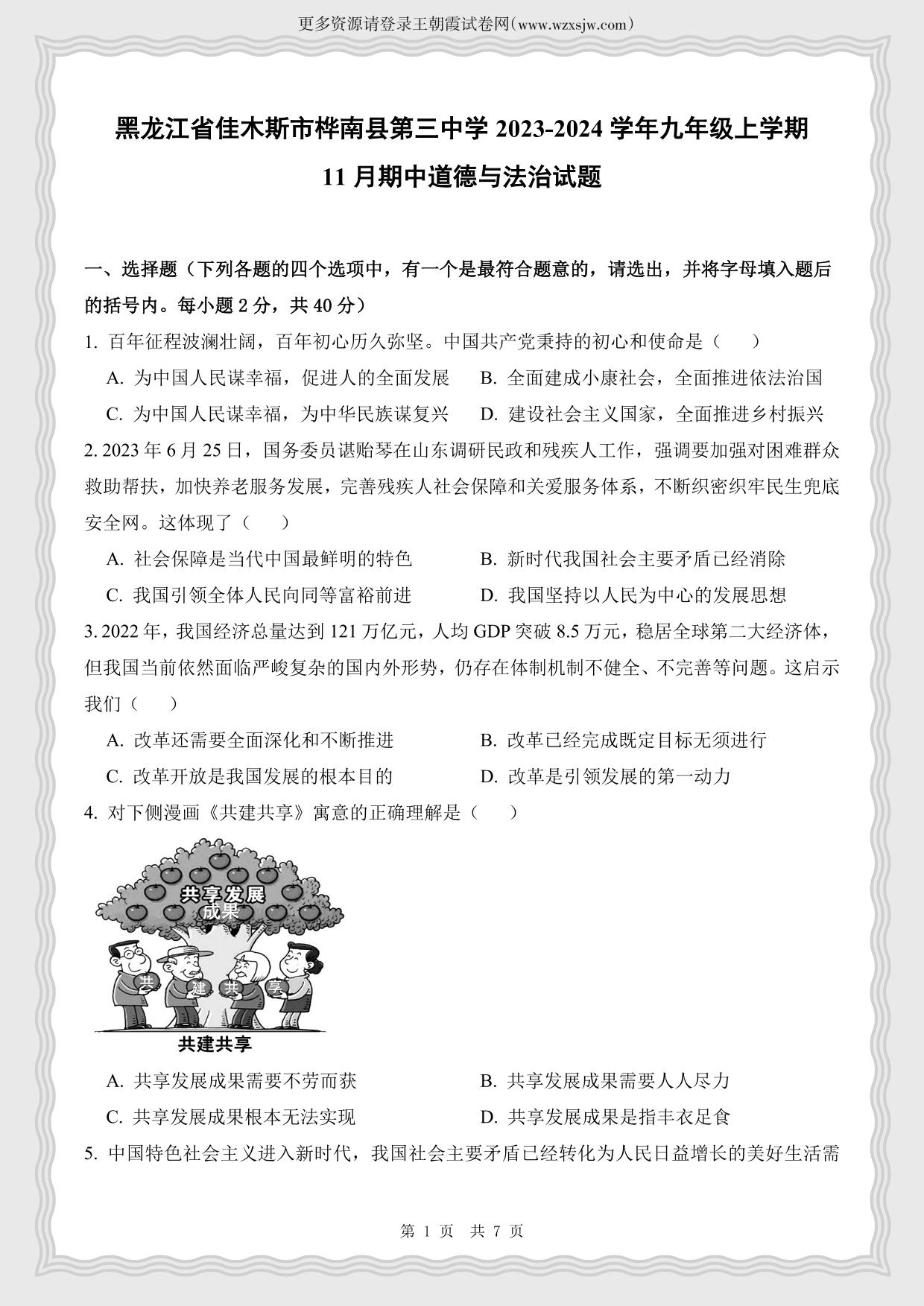 黑龙江省佳木斯市桦南县第三中学2023-2024学年第一学期11月期中试题九年级道德与法治(人教版)