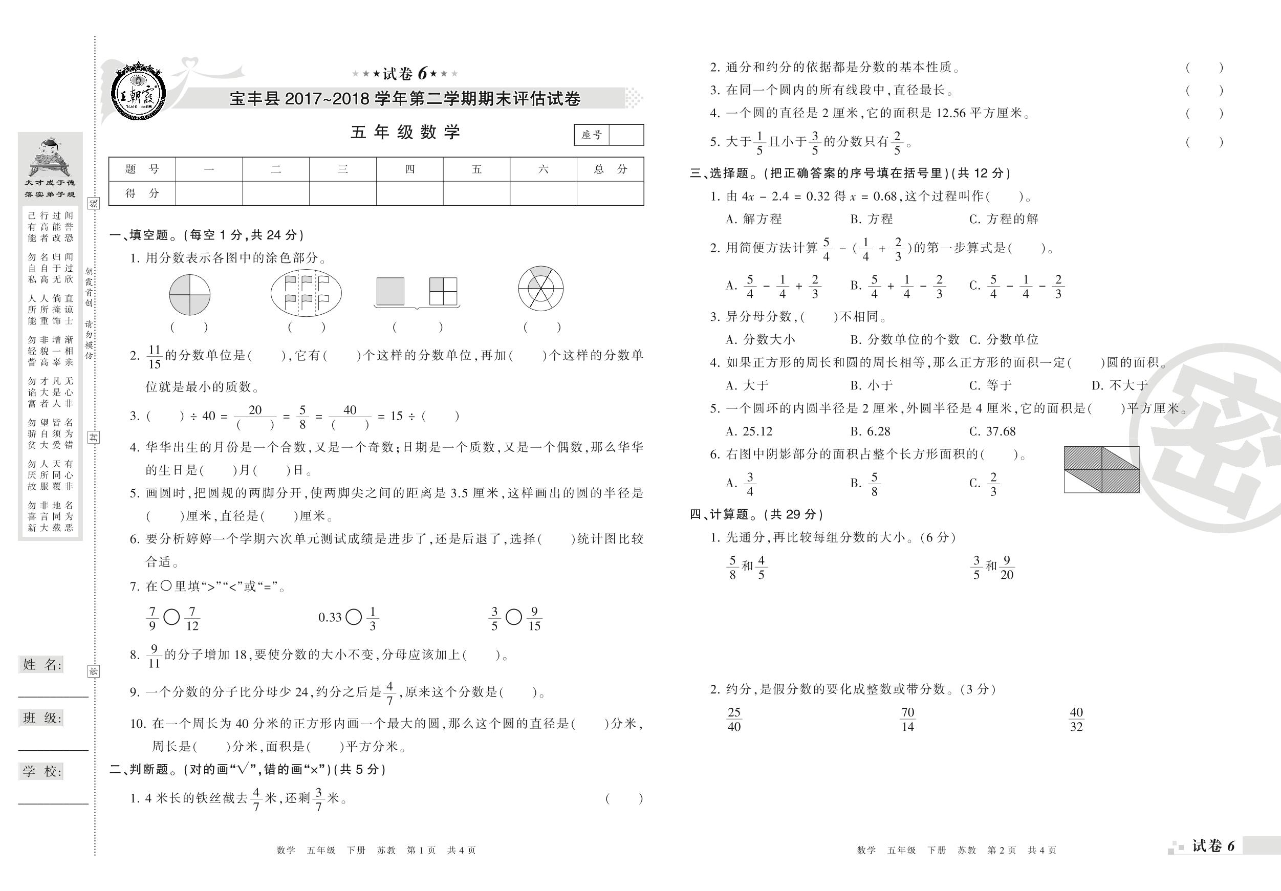 2017-2018学年第二学期平顶山市宝丰县五年级数学试卷(苏教版)【6】