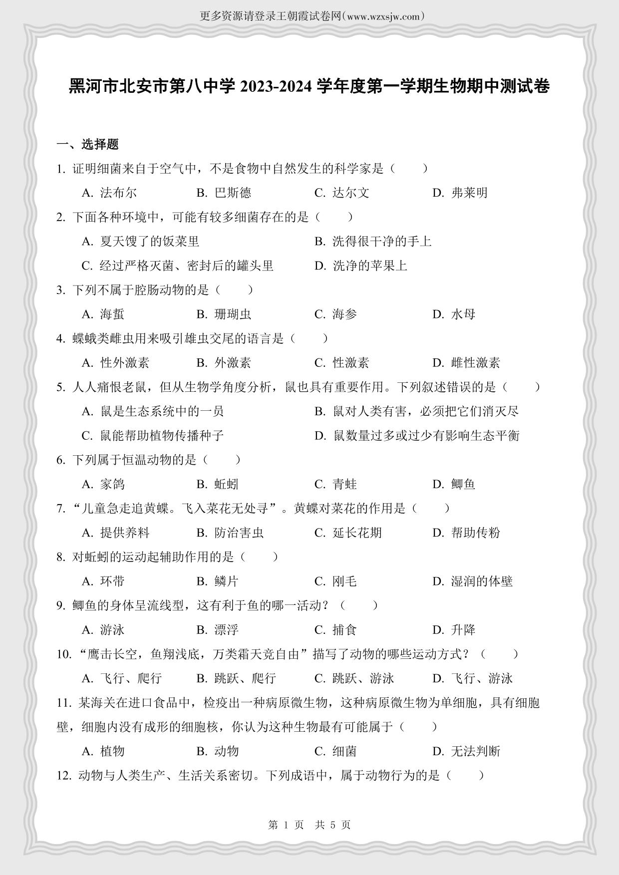 黑龙江省黑河市北安市第八中学校2023-2024学年第一学期期中测试卷八年级生物(人教版)