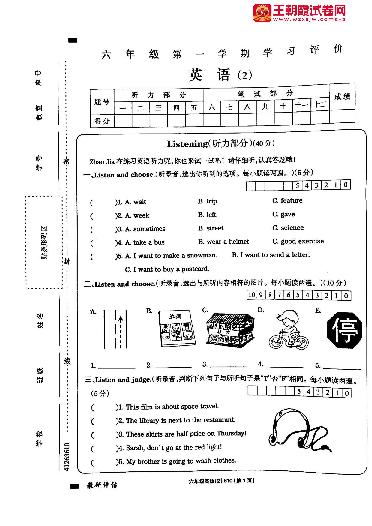 六年级英语人教PEP版(三起始)上册期中卷