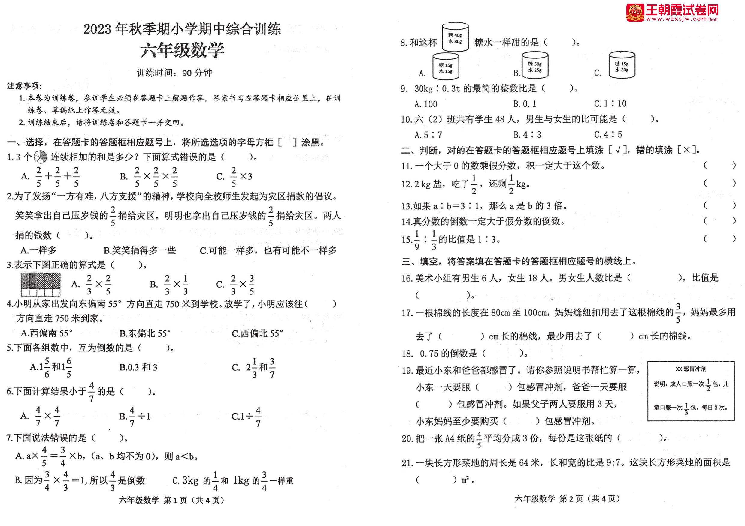 广西玉林市博白县2023-2024学年上学期期中综合训练六年级数学(人教版)
