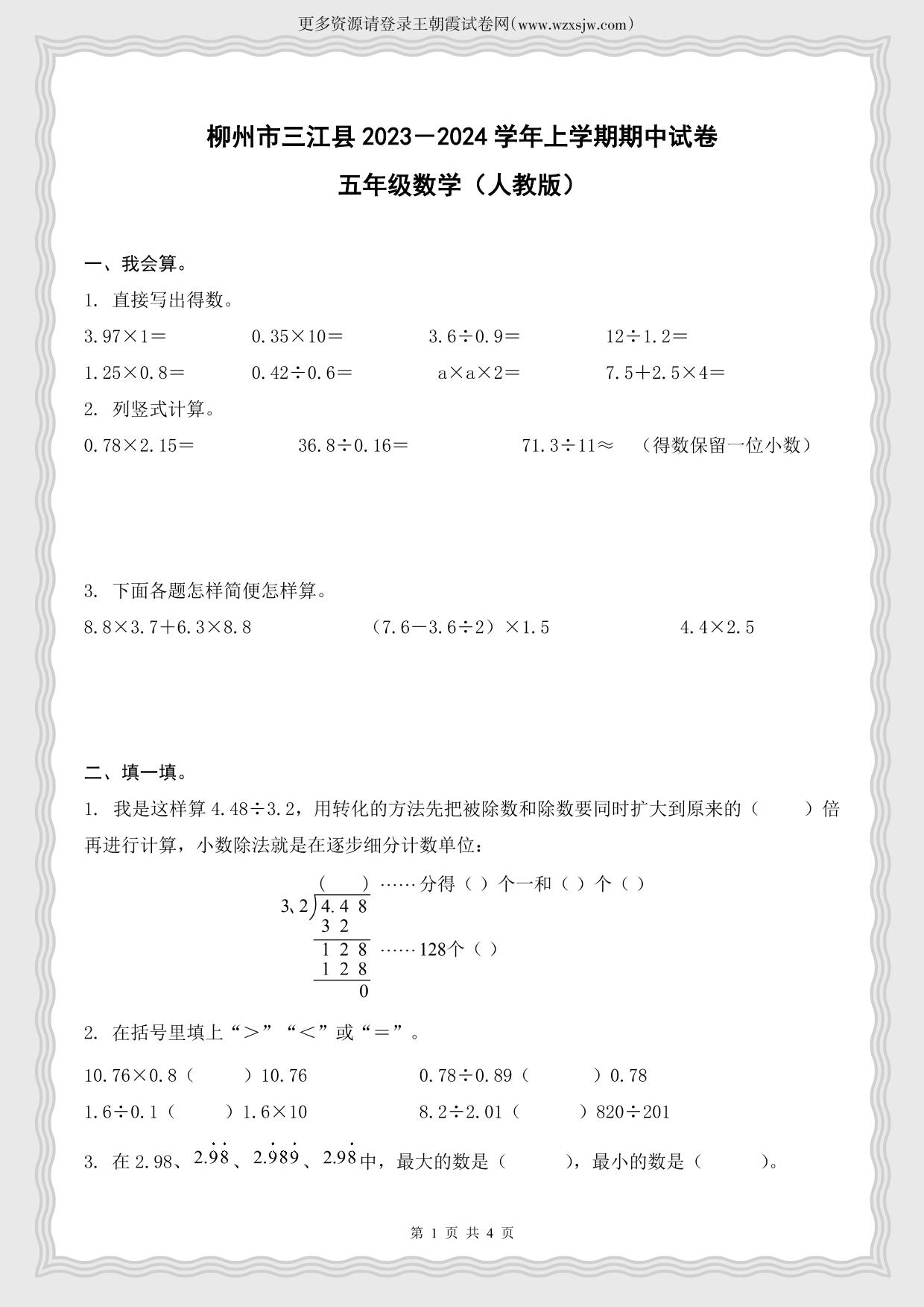 广西柳州市三江县2023-2024学年上学期期中试卷五年级数学(人教版)
