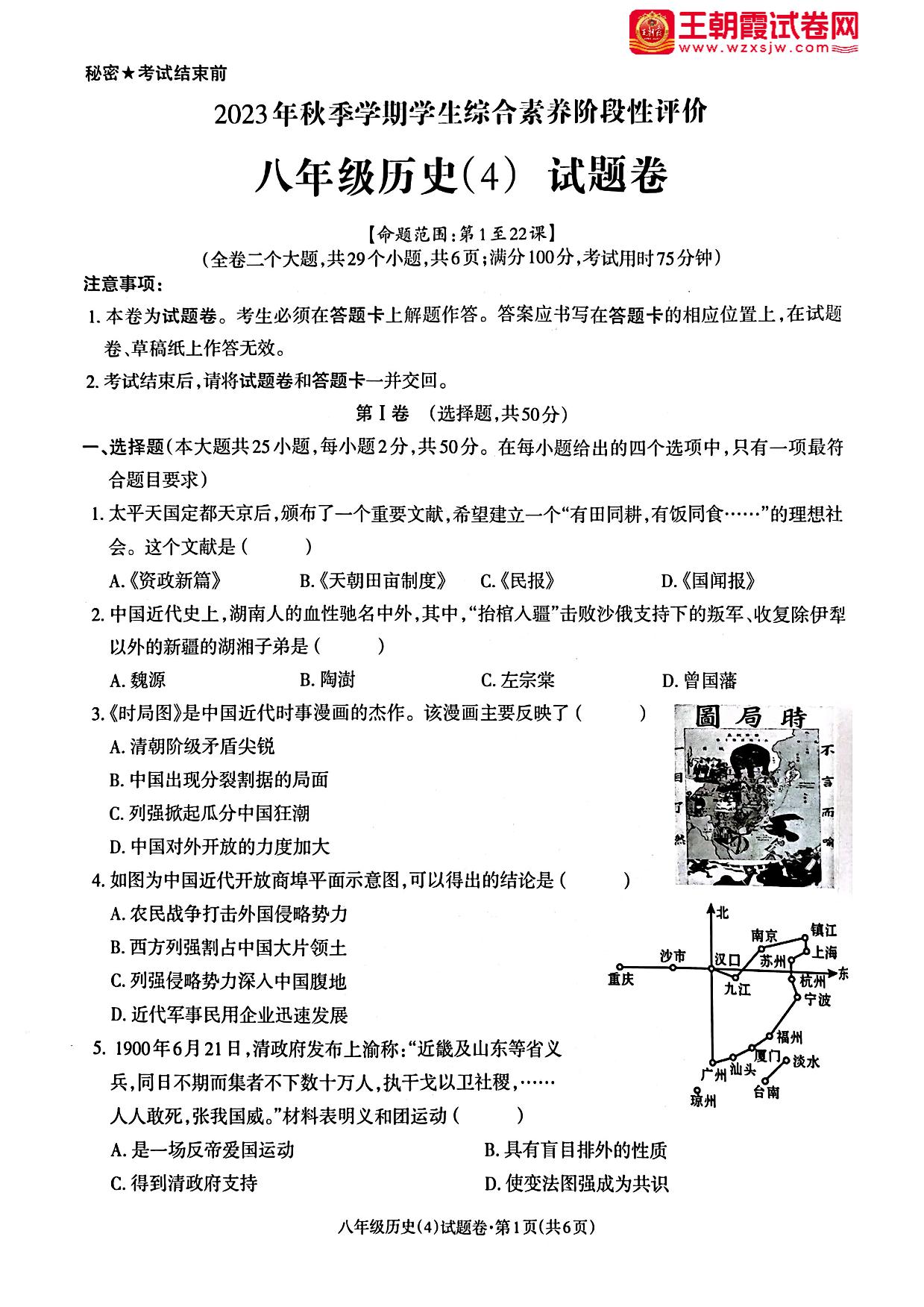 云南省昭通市昭阳区2023-2024学年上学期学生综合素养阶段性评价12月月考试题卷八年级历史(人教版)