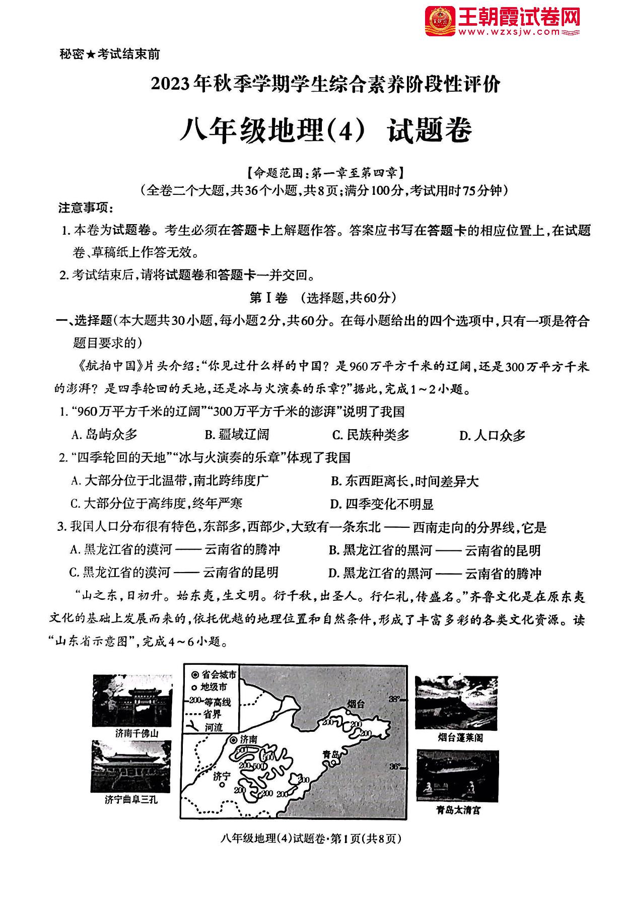 云南省昭通市昭阳区2023-2024学年上学期学生综合素养阶段性评价12月月考试题卷八年级地理(人教版)