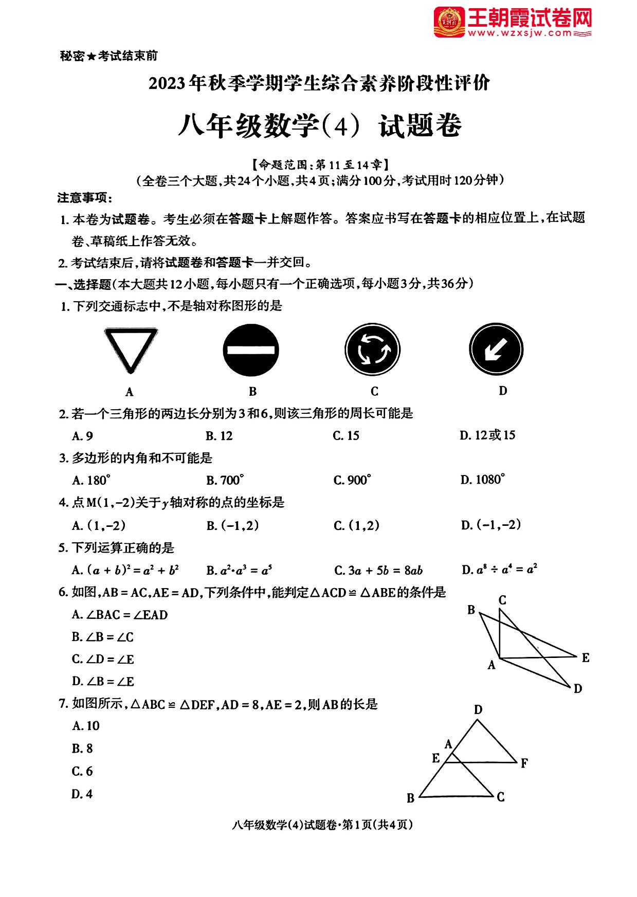 云南省昭通市昭阳区2023-2024学年上学期学生综合素养阶段性评价12月月考试题卷八年级数学(人教版)