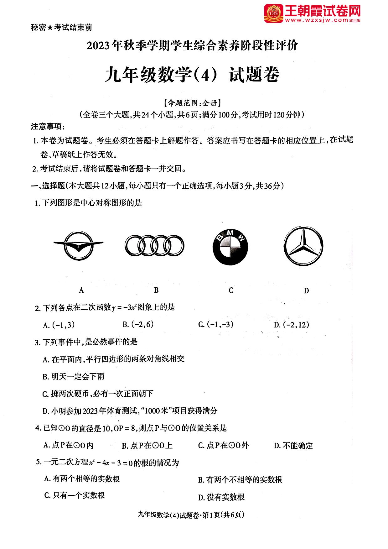 云南省昭通市昭阳区2023-2024学年上学期学生综合素养阶段性评价12月月考试题卷九年级数学(人教版)