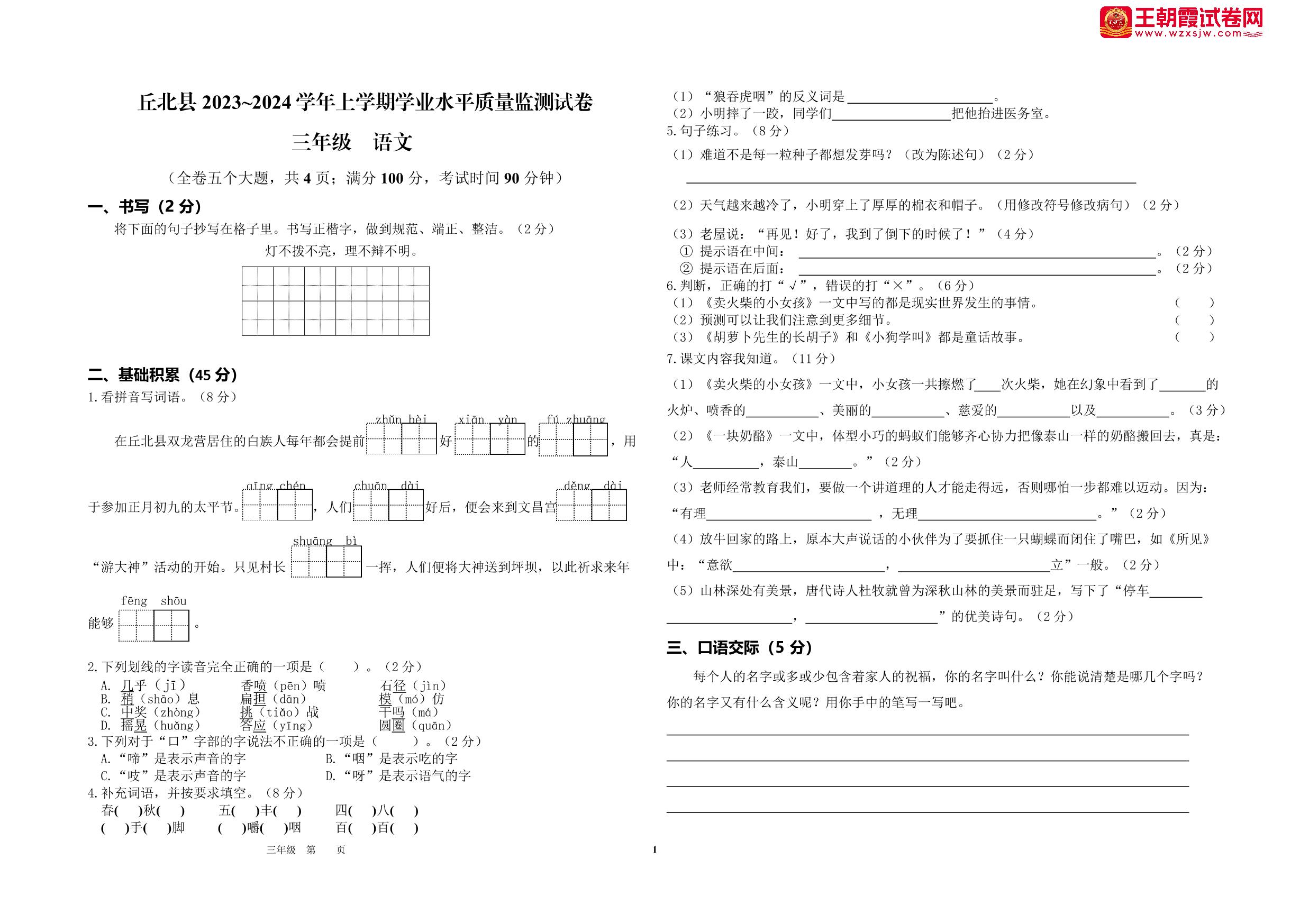 云南省文山壮族苗族自治州丘北县2023-2024学年上学期教学质量检测第二次月考试卷三年级语文(人教版)