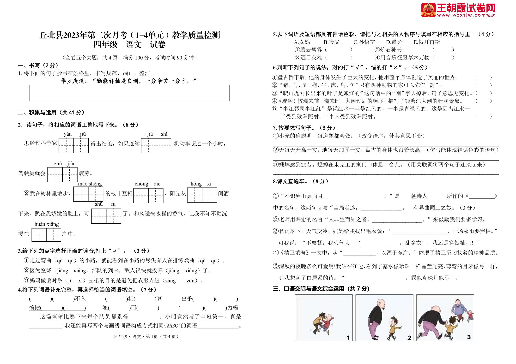云南省文山壮族苗族自治州丘北县2023-2024学年上学期教学质量检测第二次月考试卷四年级语文(人教版)