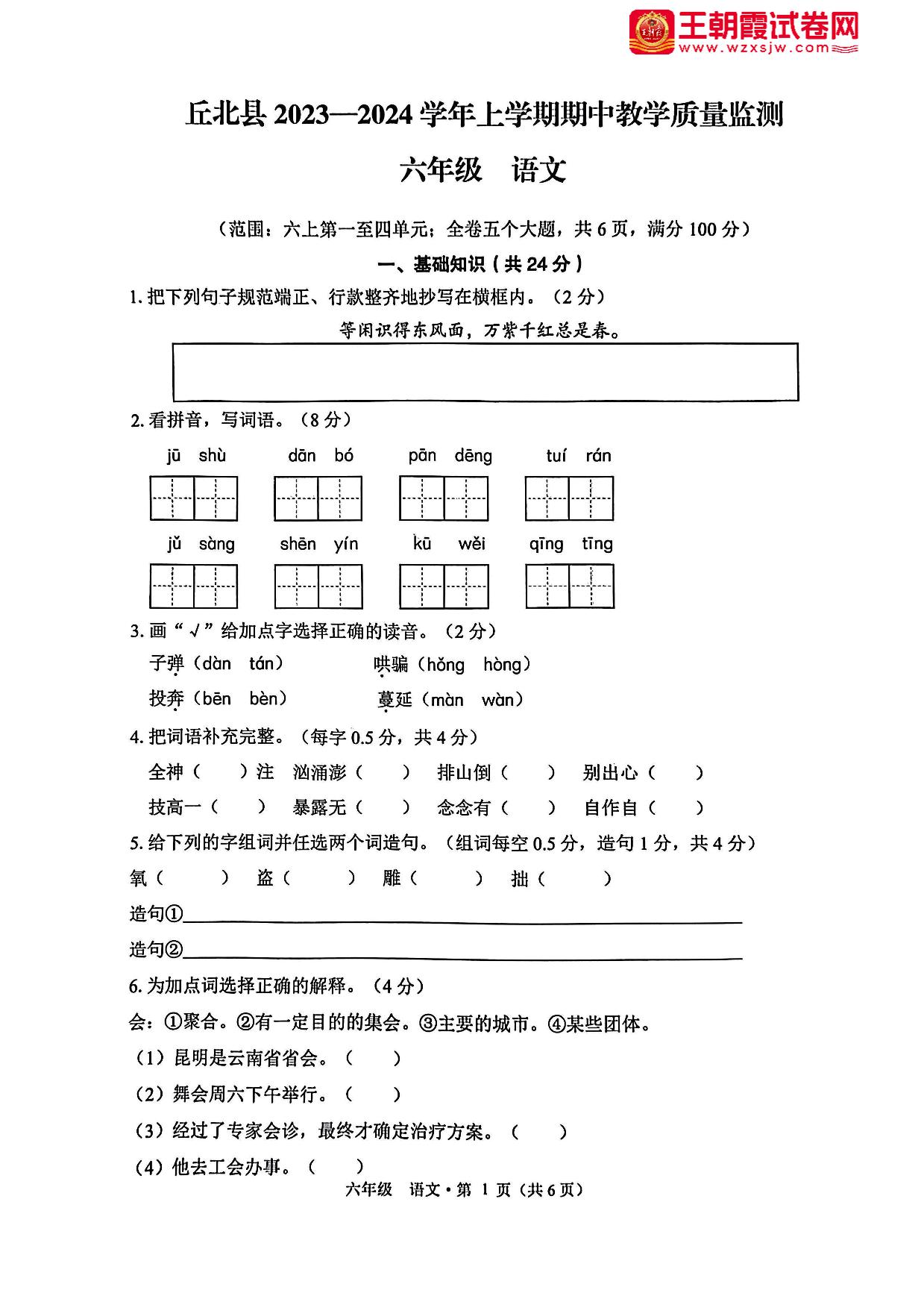 云南省文山壮族苗族自治州丘北县2023-2024学年上学期期中教学质量检测试卷六年级语文(人教版)