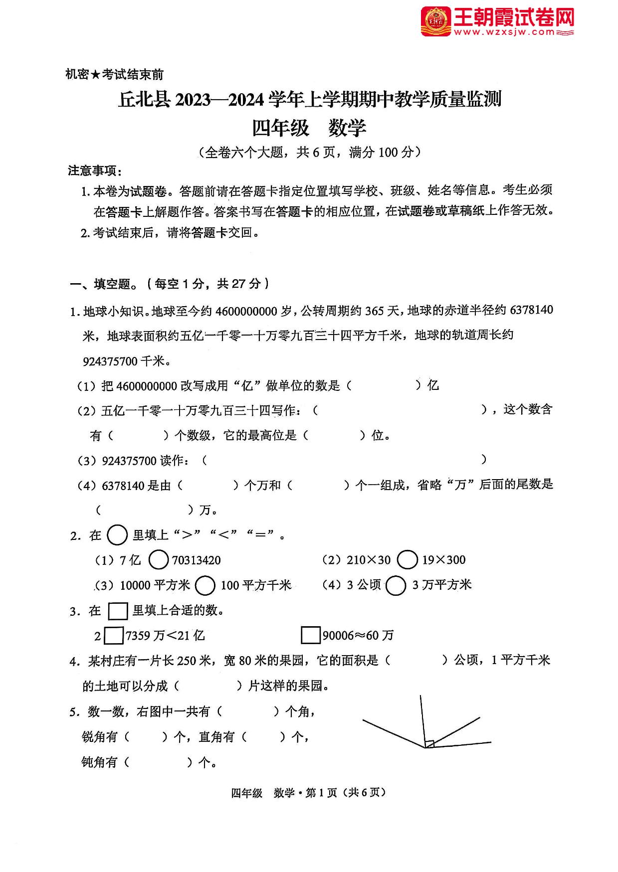 云南省文山壮族苗族自治州丘北县2023-2024学年上学期期中教学质量检测试卷四年级数学(人教版)