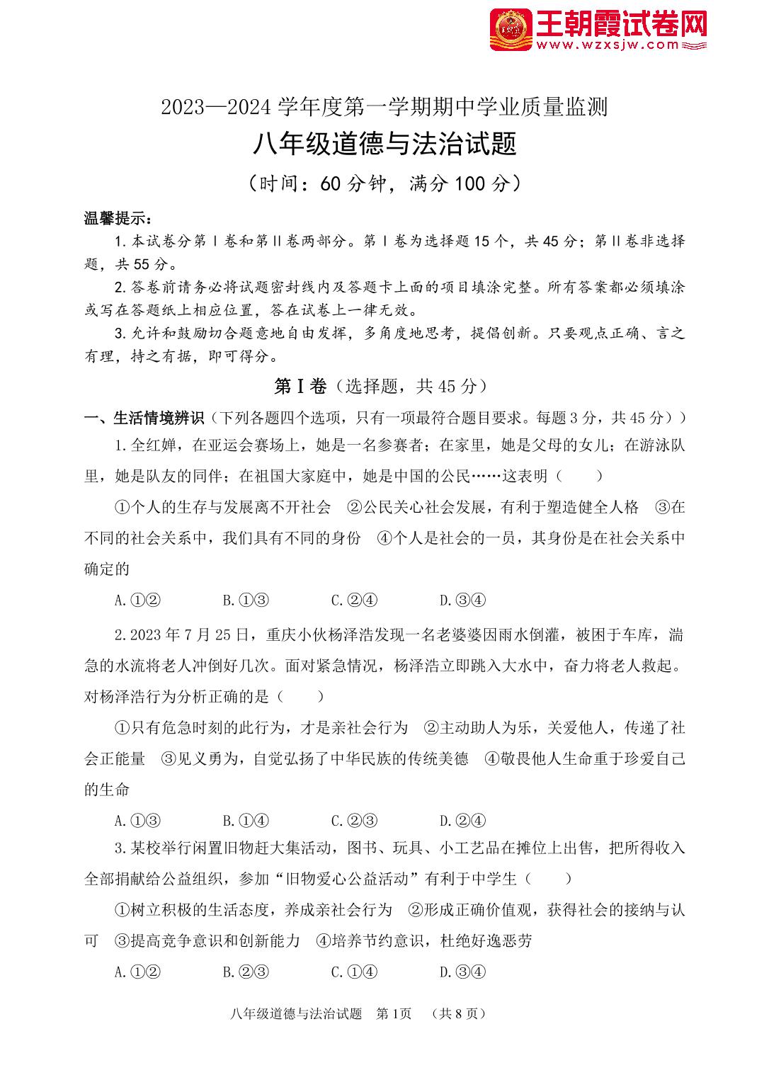 山东省潍坊市临朐县2023-2024学年度第一学期期中学业质量监测八年级道德与法治(人教版)