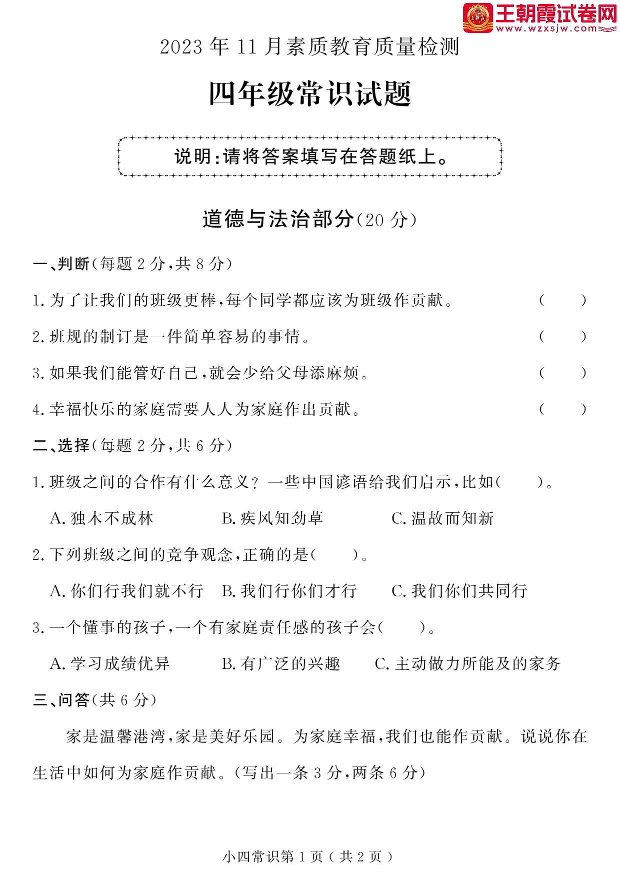 山东省菏泽市曹县2023-2024学年上学期期中素质教育质量检测四年级道德与法治、科学综合试卷