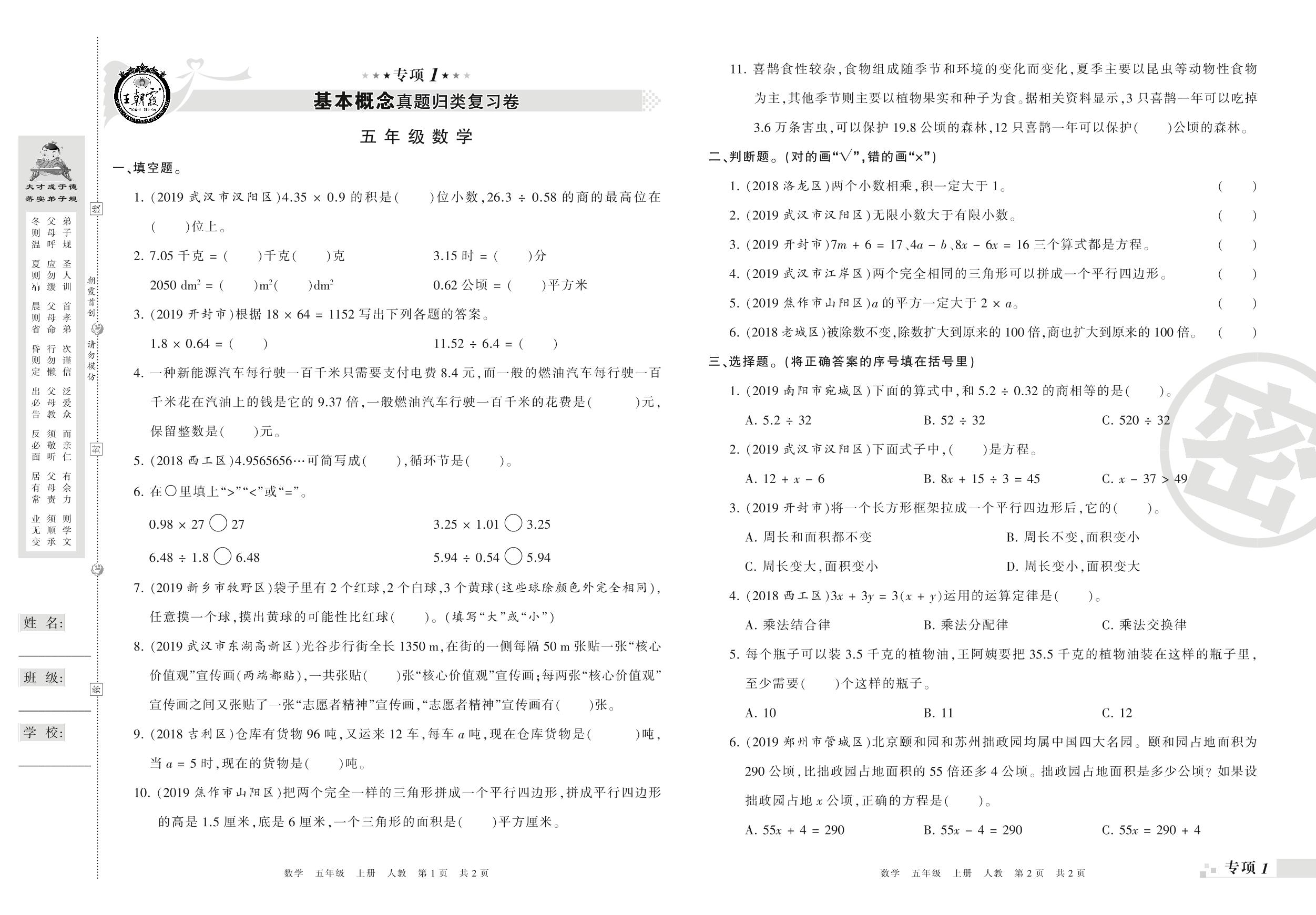 王朝霞期末专项卷——基本概念、计算真题归类复习五年级上册数学(人教版)_R210804172302【0】