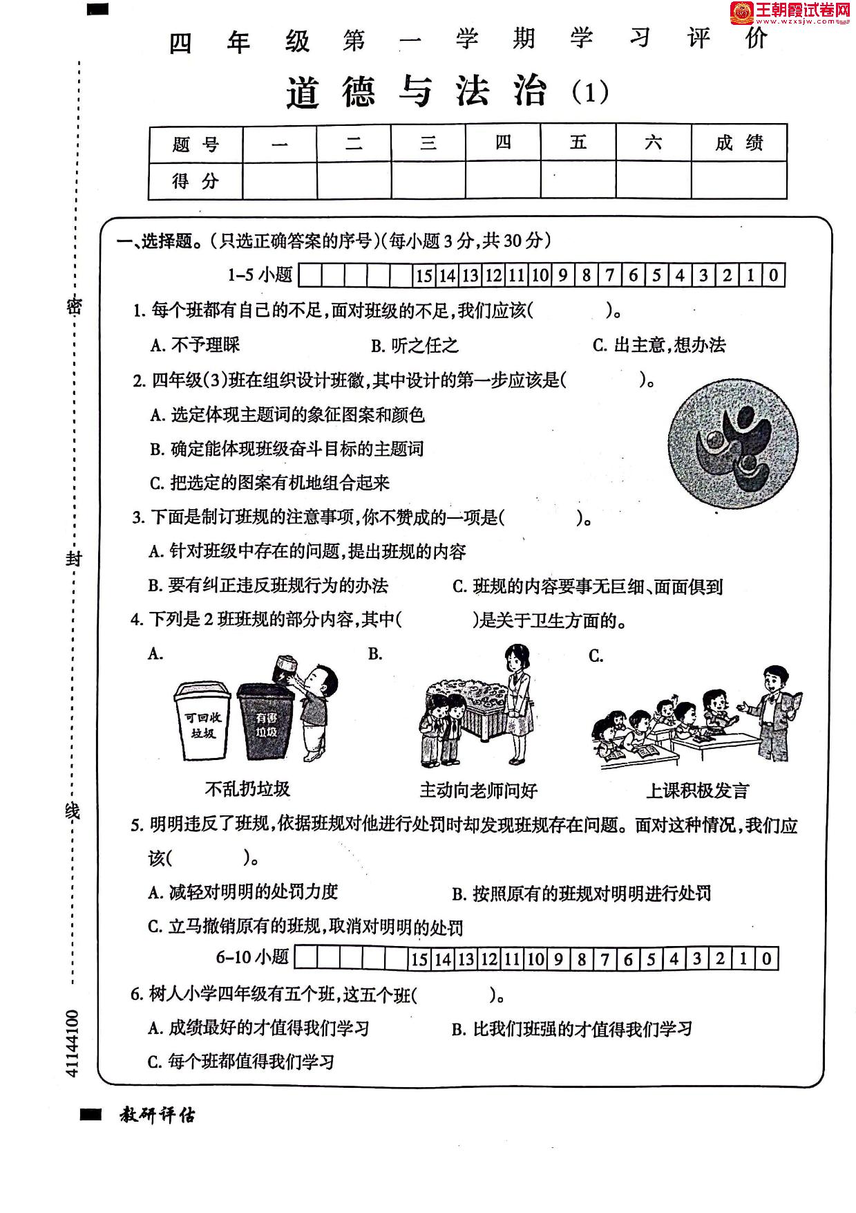 山东省德州市宁津县第二实验小学2023-2024学年第一学期学习评价(月考)四年级道德与法治(人教版)