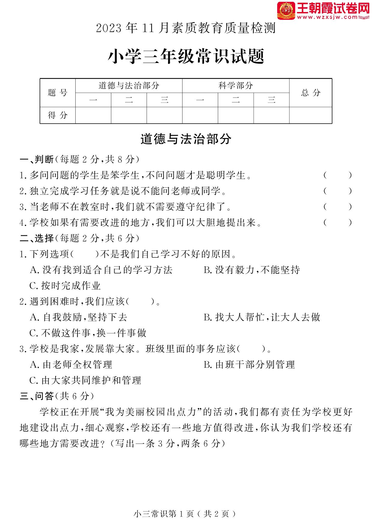 山东省菏泽市曹县2023-2024学年上学期期中素质教育质量检测三年级道德与法治、科学综合试卷