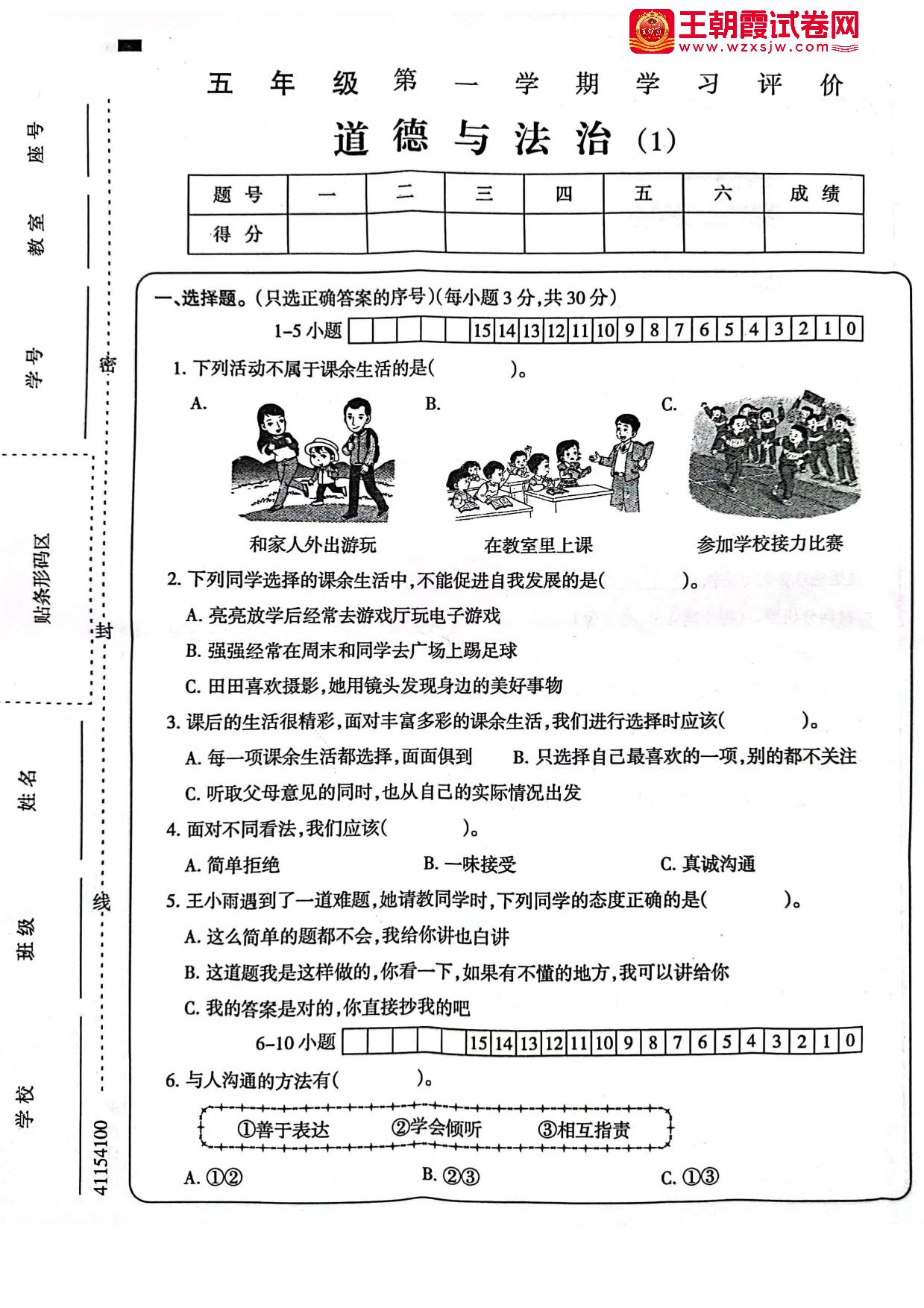 山东省德州市宁津县第二实验小学2023-2024学年第一学期学习评价(月考)五年级道德与法治(人教版)