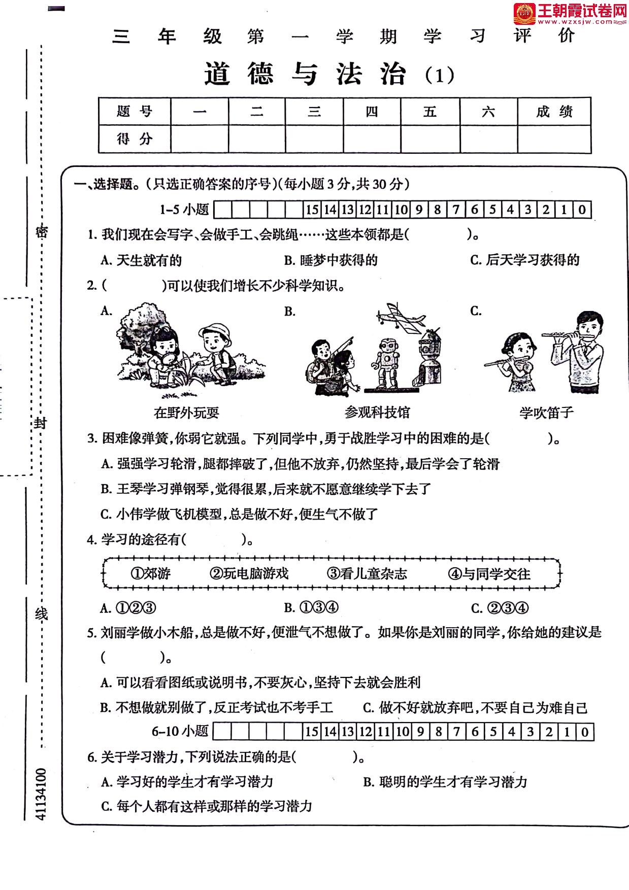 山东省德州市宁津县第二实验小学2023-2024学年第一学期学习评价(月考)三年级道德与法治(人教版)
