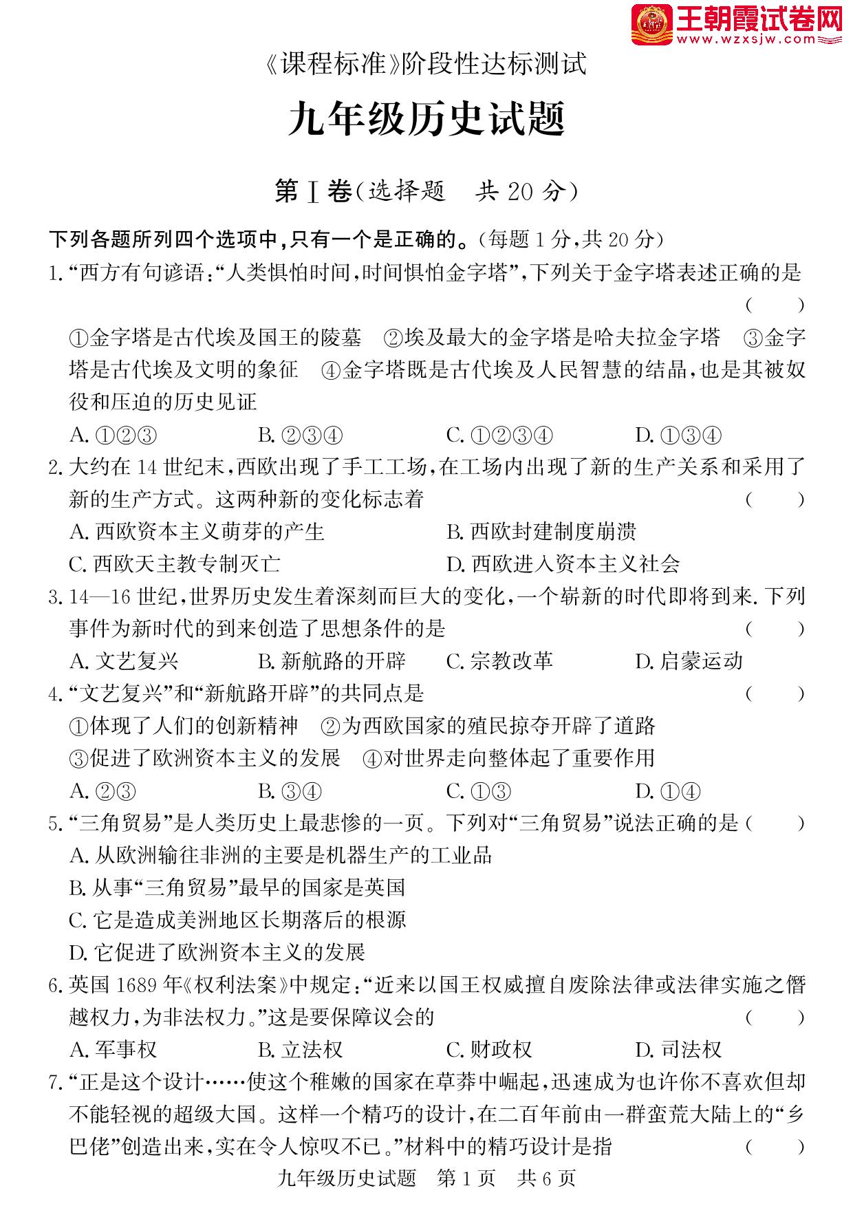 山东省济宁市泗水县2023-2024学年上学期期中阶段性达标测试九年级历史(人教版)
