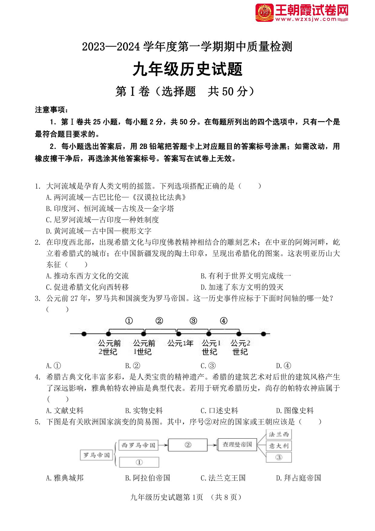 山东省济南市东南片区2023-2024学年度第一学期期中质量检测九年级历史(人教版)