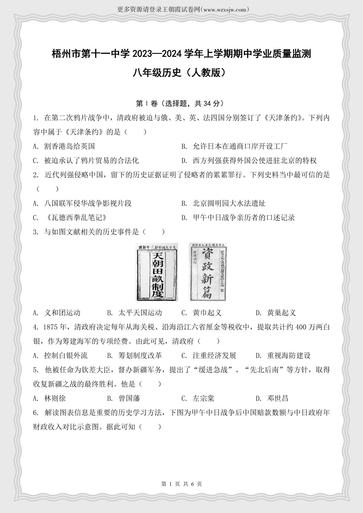 广西梧州市第十一中学2023-2024学年上学期期中学业质量监测八年级历史(人教版)