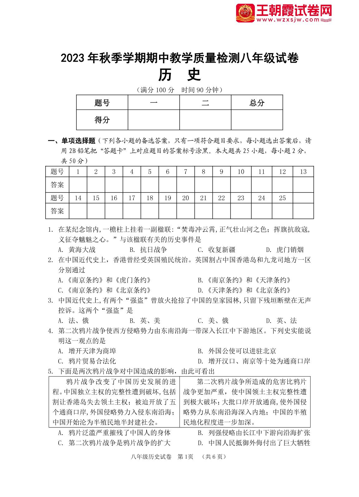 广西贺州市八步区2023-2024学年上学期期中教学质量检测八年级历史(人教版)