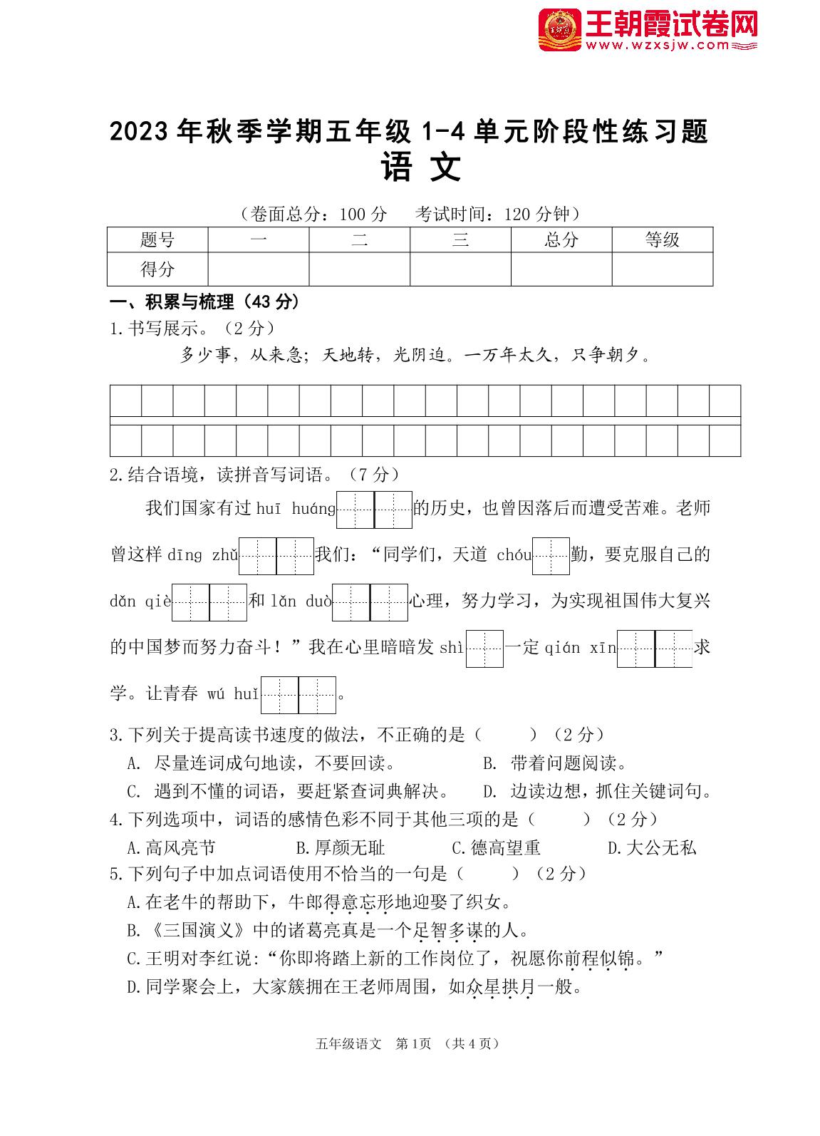 广西贺州市八步区2023-2024学年上学期期中阶段练习五年级语文(人教版)