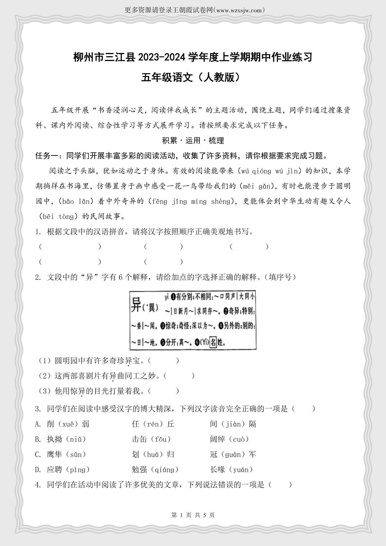 广西柳州市三江县2023-2024学年度上学期期中作业练习五年级语文(人教版)
