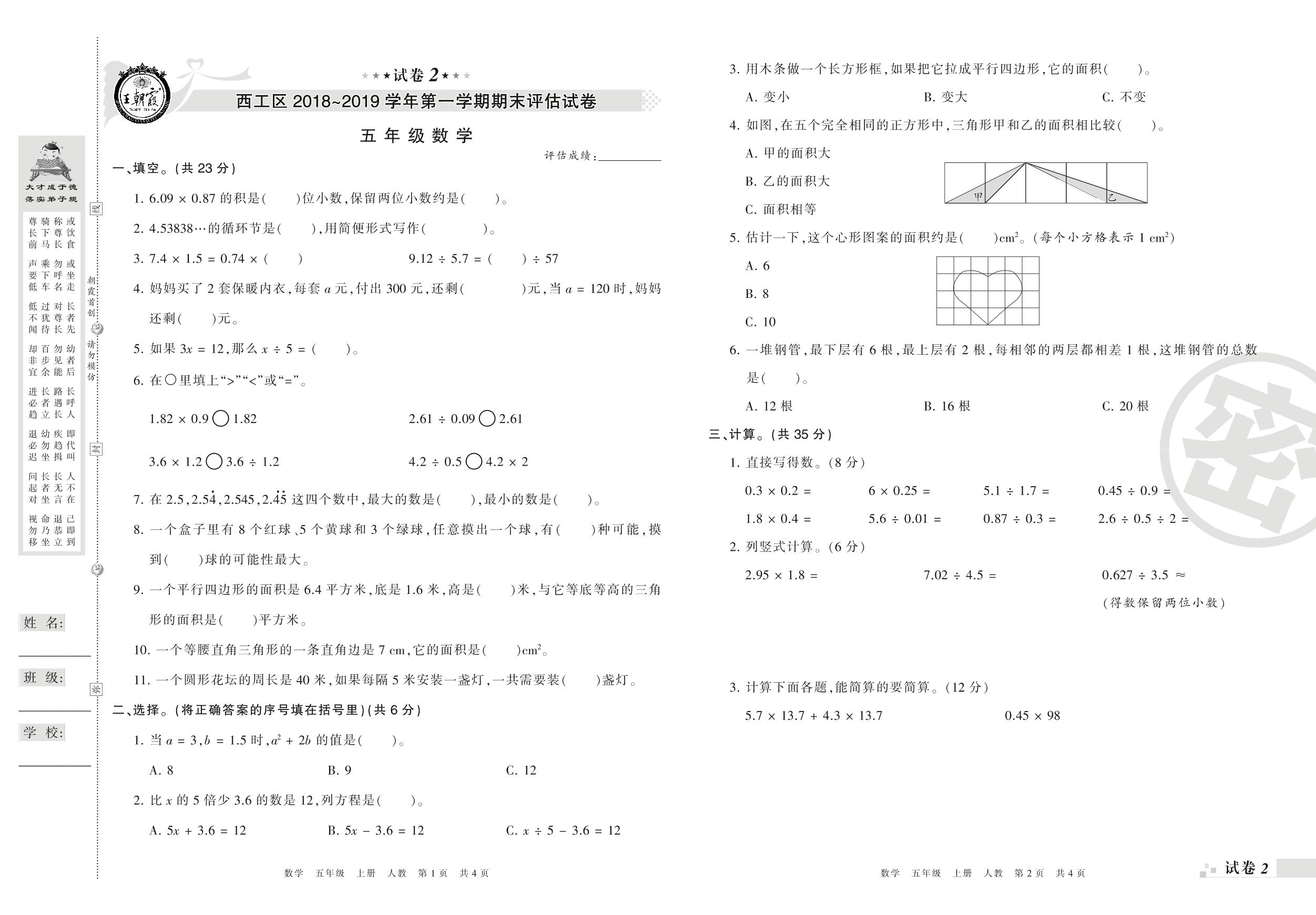 2018-2019学年第一学期洛阳市西工区五年级数学试卷(人教版)【2】