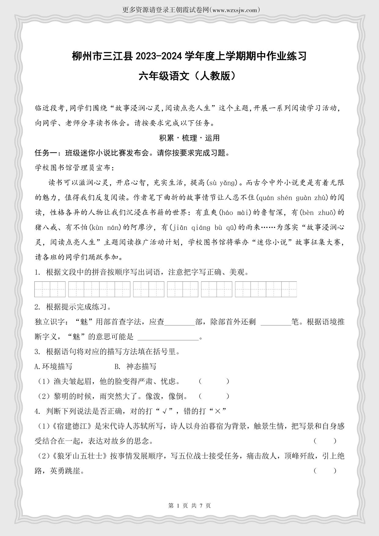 广西柳州市三江县2023-2024学年度上学期期中作业练习六年级语文(人教版)