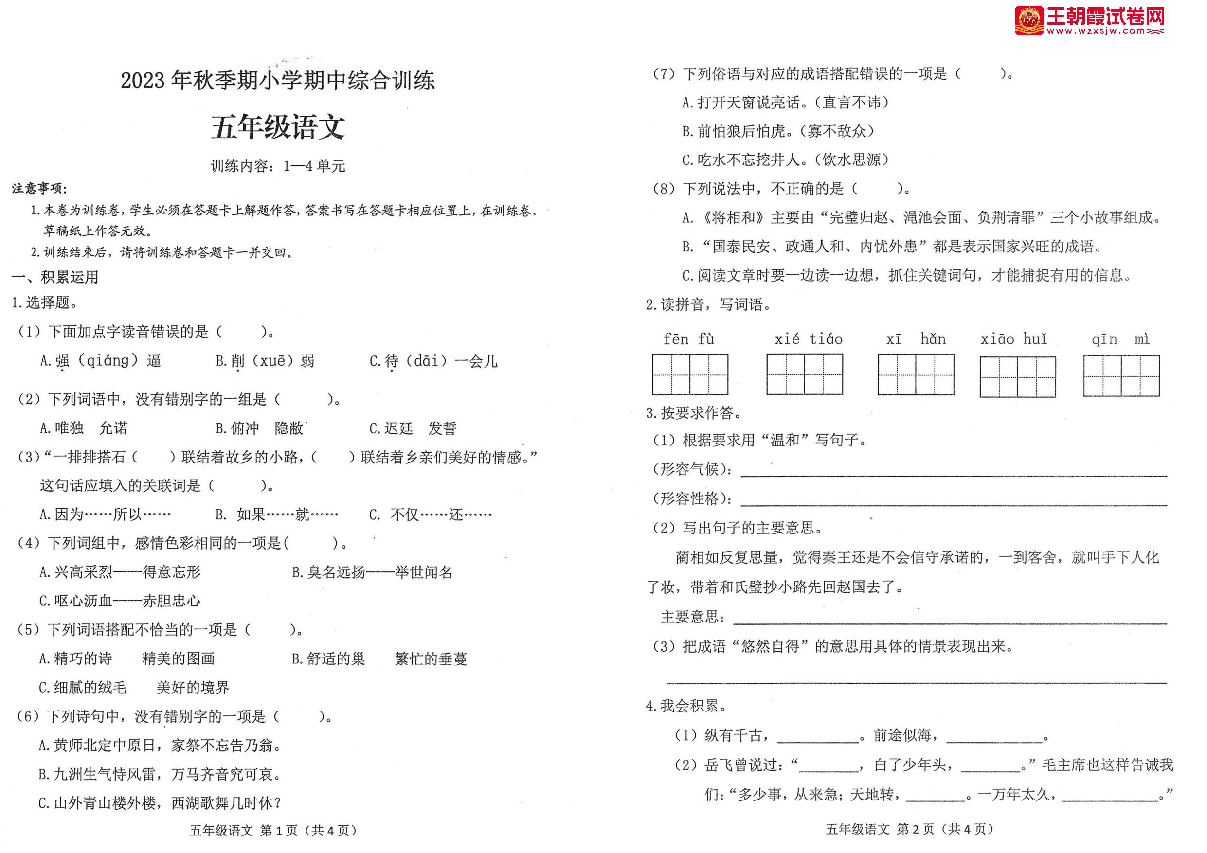 五年级语文人教版上册期中卷