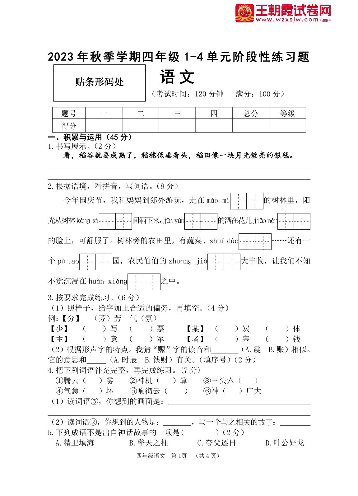 四年级语文人教版上册期中卷